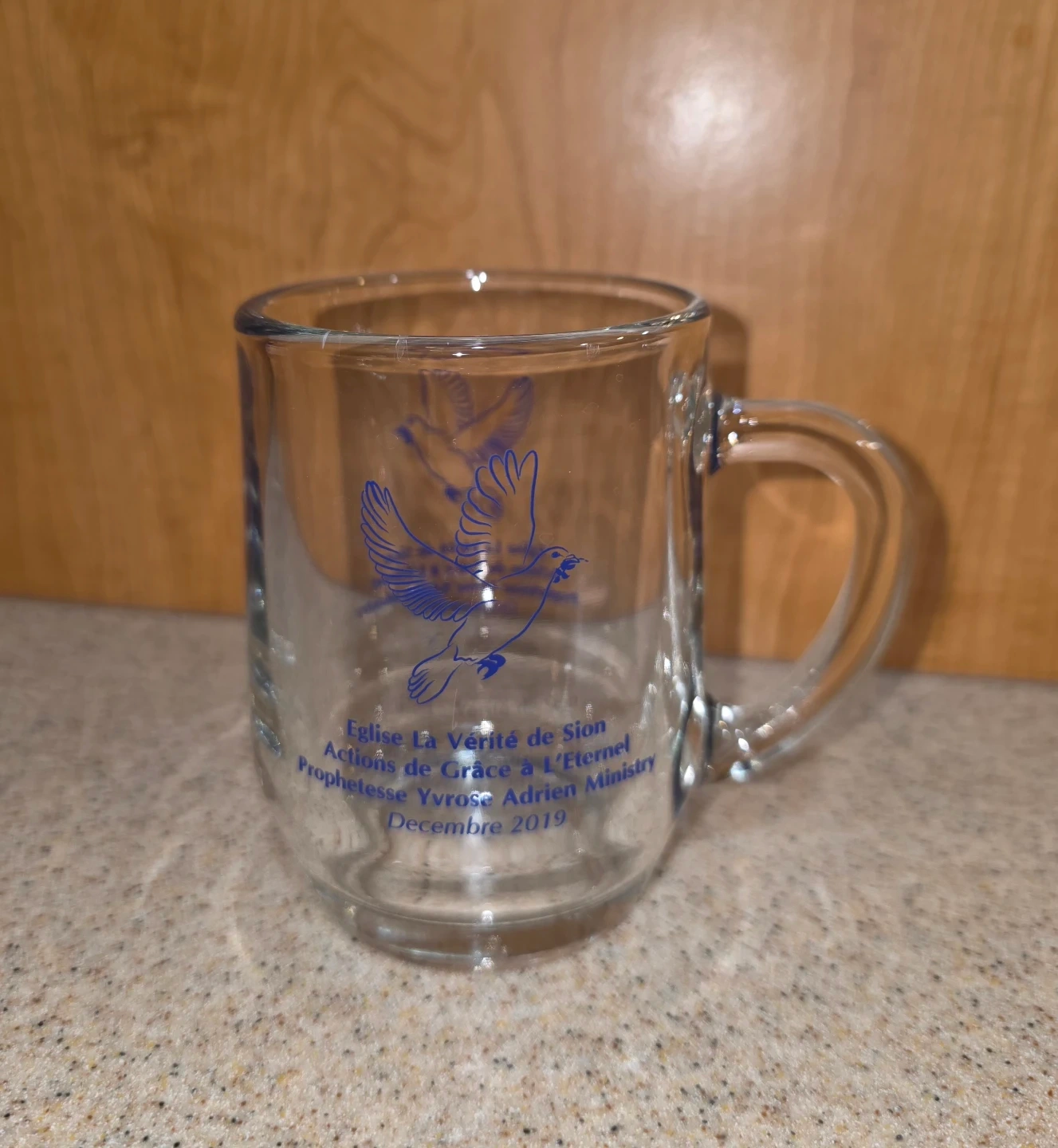 This is a clear glass mug commemorating the "Eglise La Vérité de Sion" event in December 2019. It features a blue graphic of a dove and text related to the ministry. Translation, Truth Church