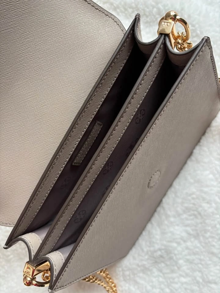 Chic Tory Burch crossbody in taupe. Features elegant gold chain strap. Perfect for versatile styling.