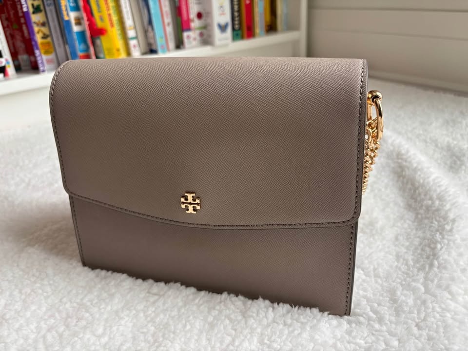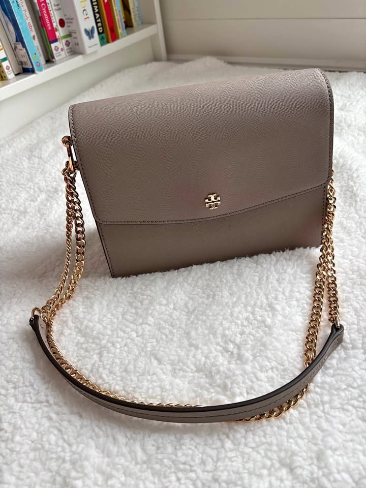 Chic Tory Burch crossbody in taupe. Features elegant gold chain strap. Perfect for versatile styling.