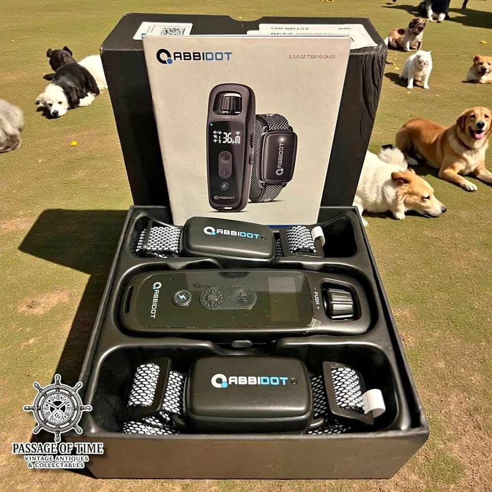 The product shown is an ABBIDOT Dog Training Collar with a remote. The training collar has 5 modes: Tone, Light, Vibration, General Stimulation, and Boosted Stimulation. It is waterproof (IPX7), while the remote is not. The remote can be used to train two dogs by switching between channels. The collar is designed with a safety lock and an auto-shutoff mechanism to prevent overuse and ensure the dog's safety. It is suitable for small, medium, and large-sized dogs.