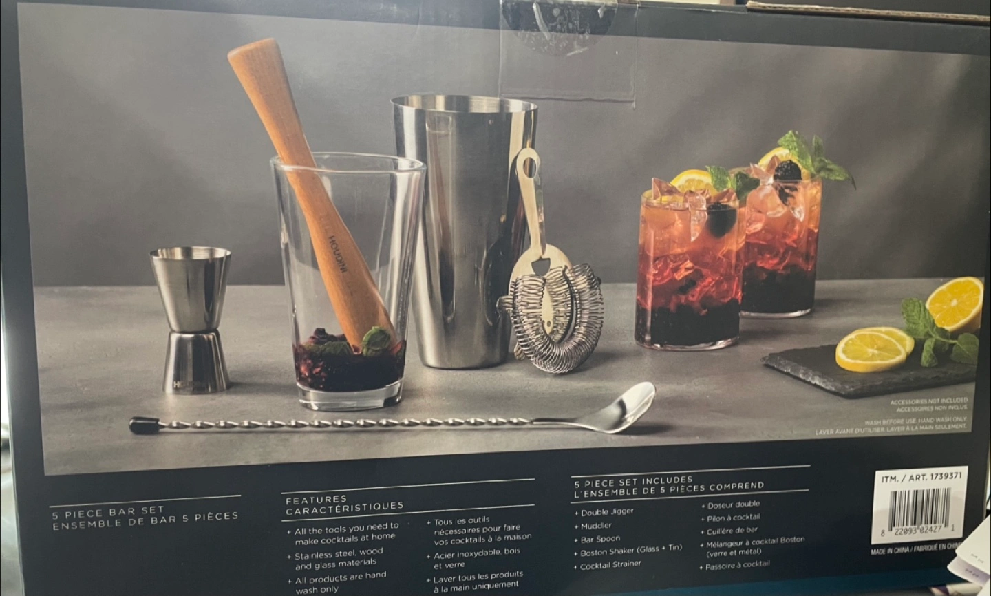 Brand new, unopened 5-piece bar set. Includes double jigger, cocktail strainer, muddler, Boston shaker, and bar spoon. Stainless steel and glass. All tools needed to make cocktails at home.