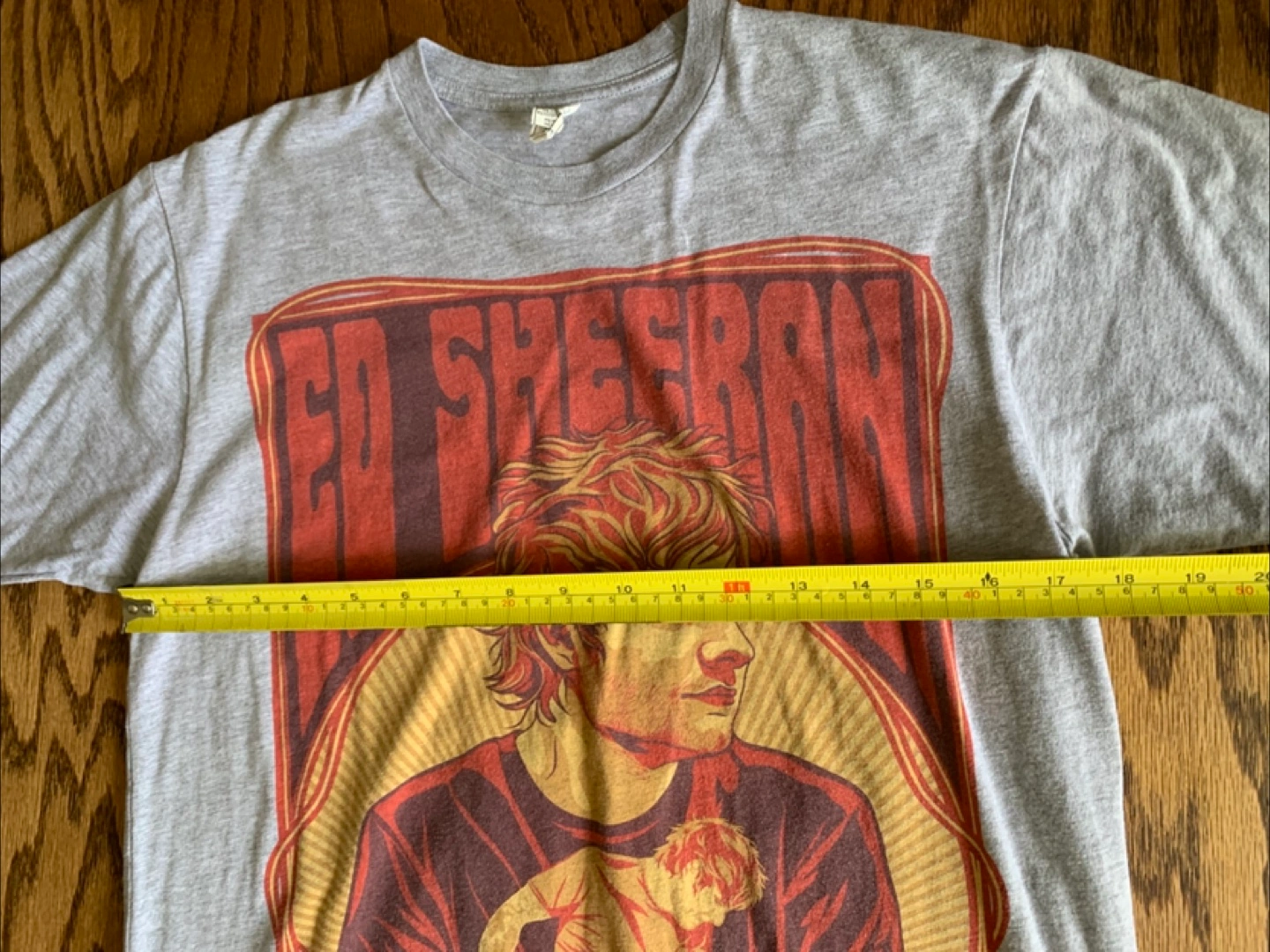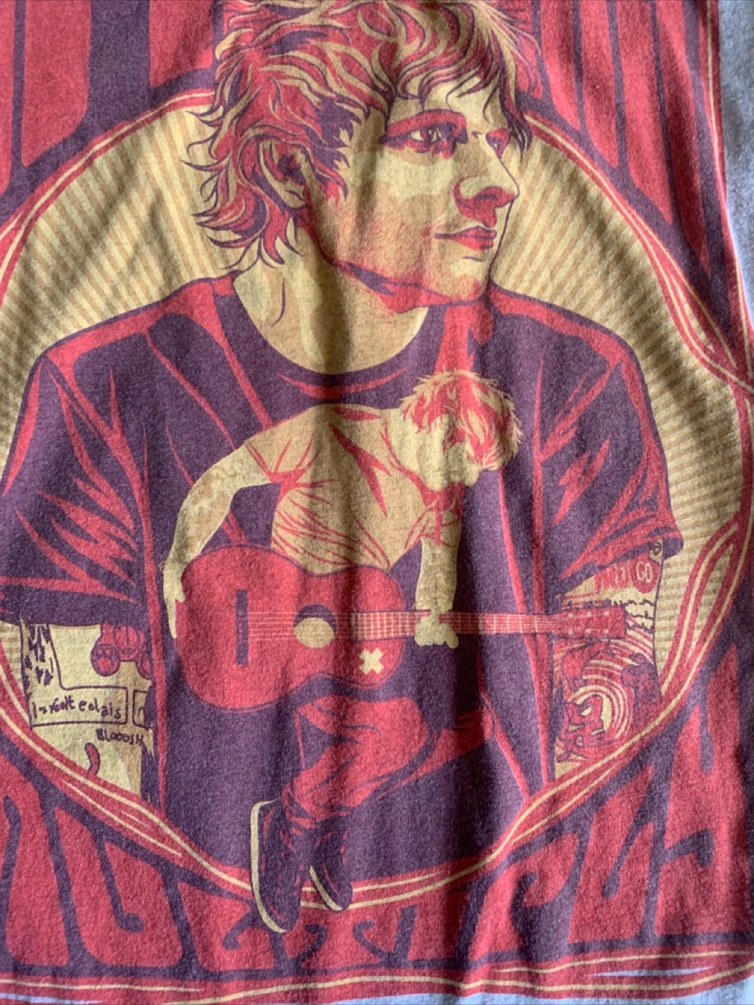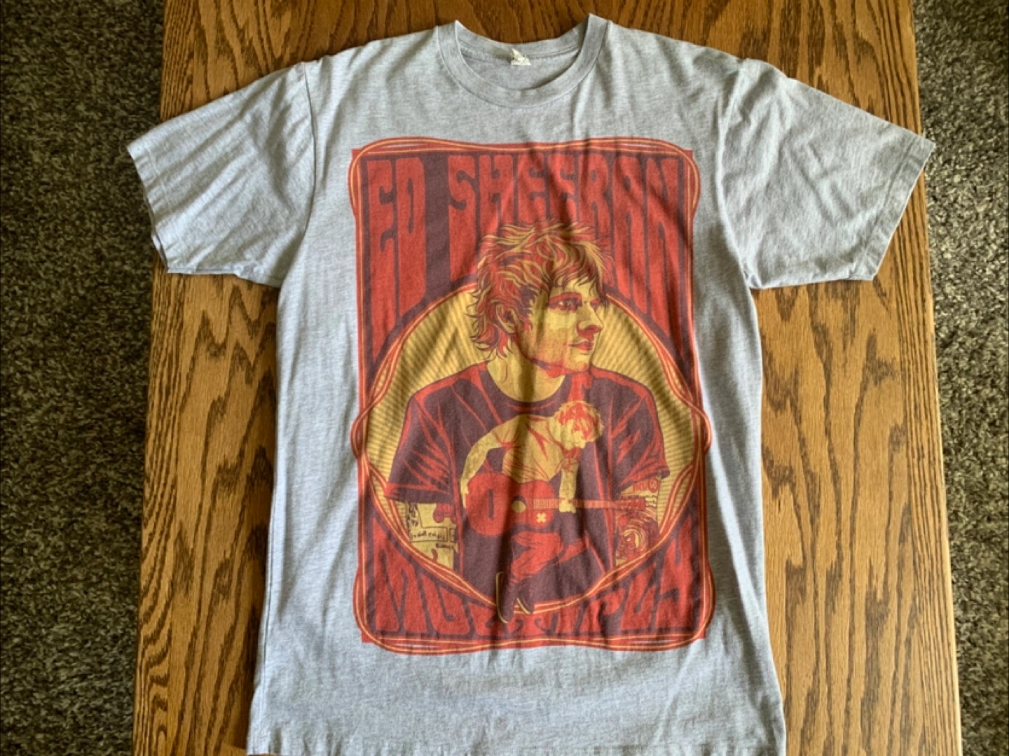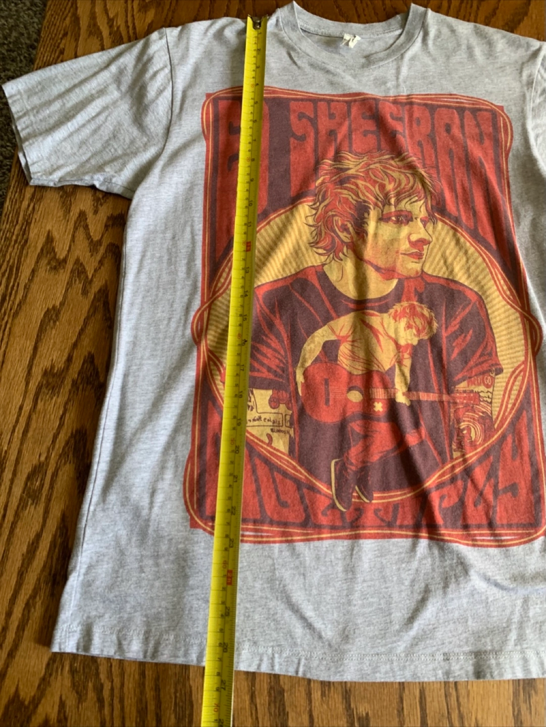 Selling a pre-owned Ed Sheeran t-shirt in size medium! The shirt is made of 90% cotton and 10% polyester. It's a light grey colour with a graphic print of Ed Sheeran on the front. Perfect for any fan!
