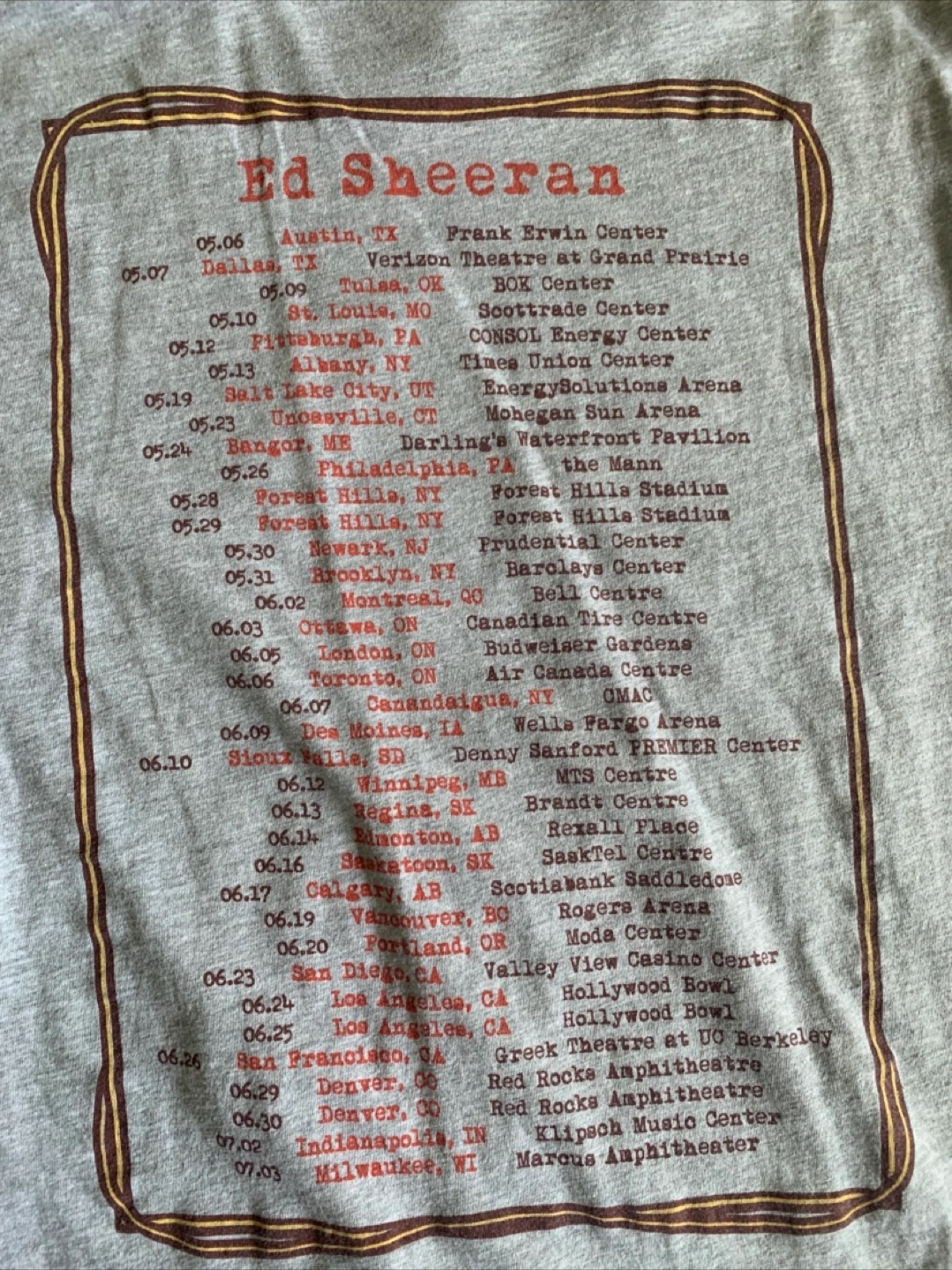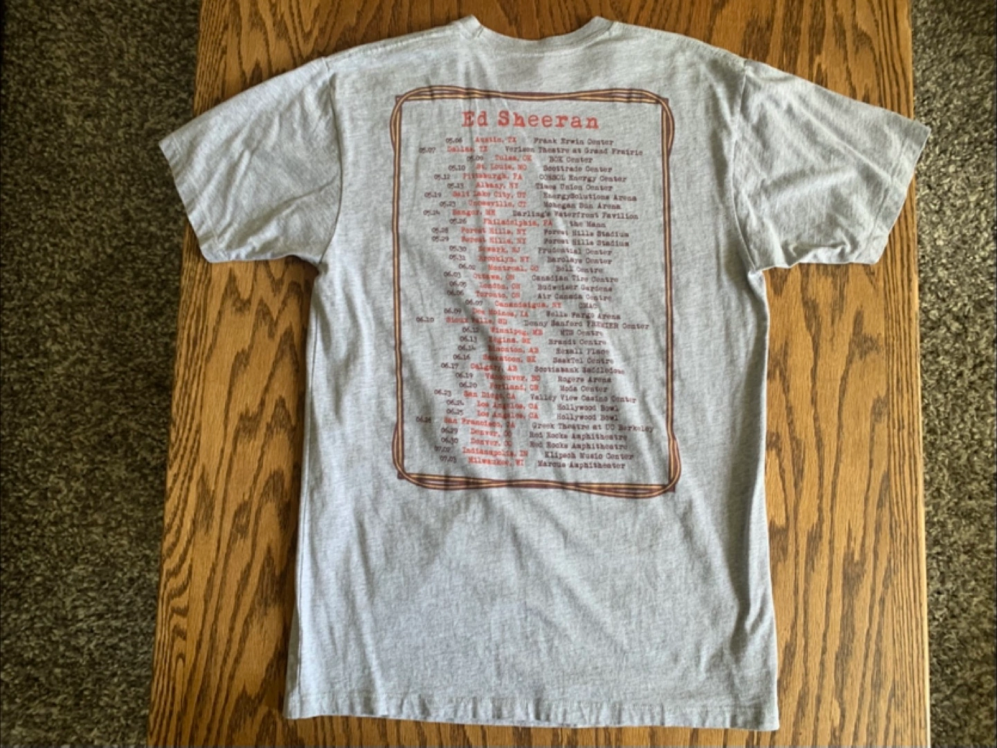 Selling a pre-owned Ed Sheeran t-shirt in size medium! The shirt is made of 90% cotton and 10% polyester. It's a light grey colour with a graphic print of Ed Sheeran on the front. Perfect for any fan!