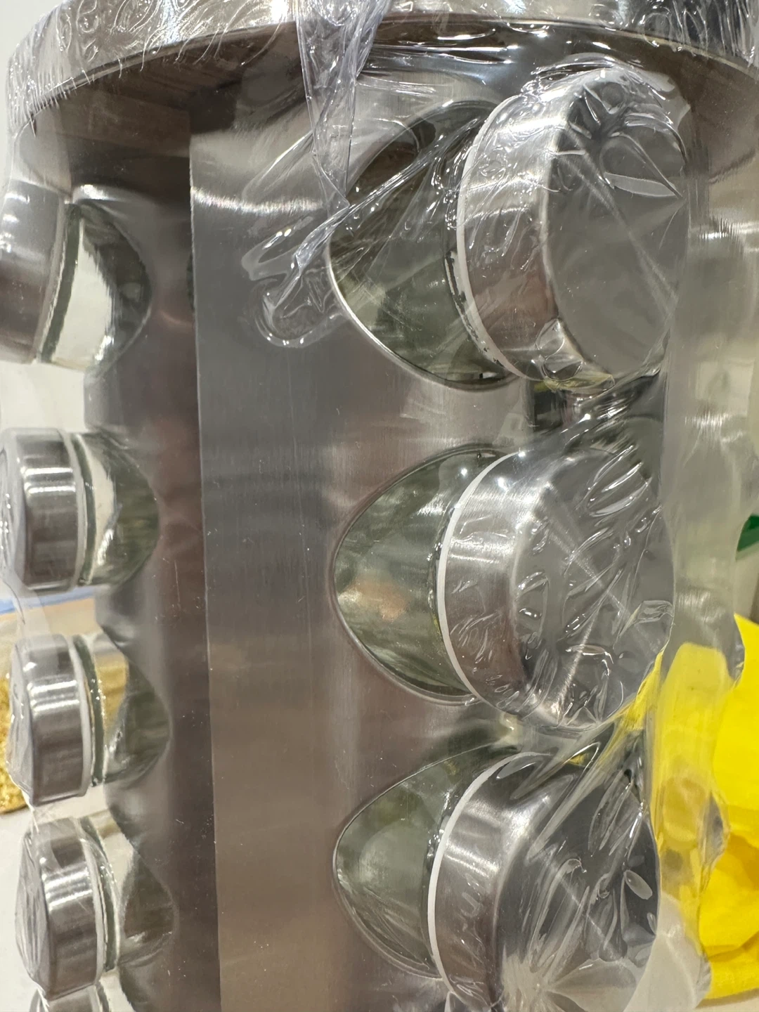 This spice carousel holds 20 jars and rotates for easy access. It's made of stainless steel and comes with glass jars. Keep your kitchen spices organized and within reach!