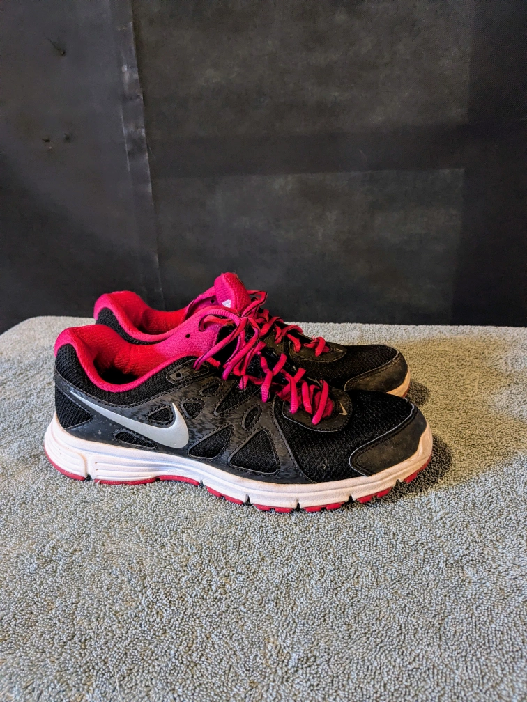 Lightly used, perfect sole and interior. Black and pink colour scheme. Good condition, minor wear. Lace-up closure. Comfortable and supportive.