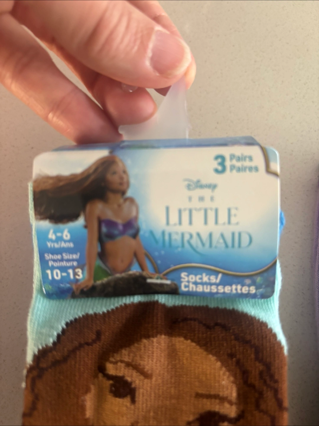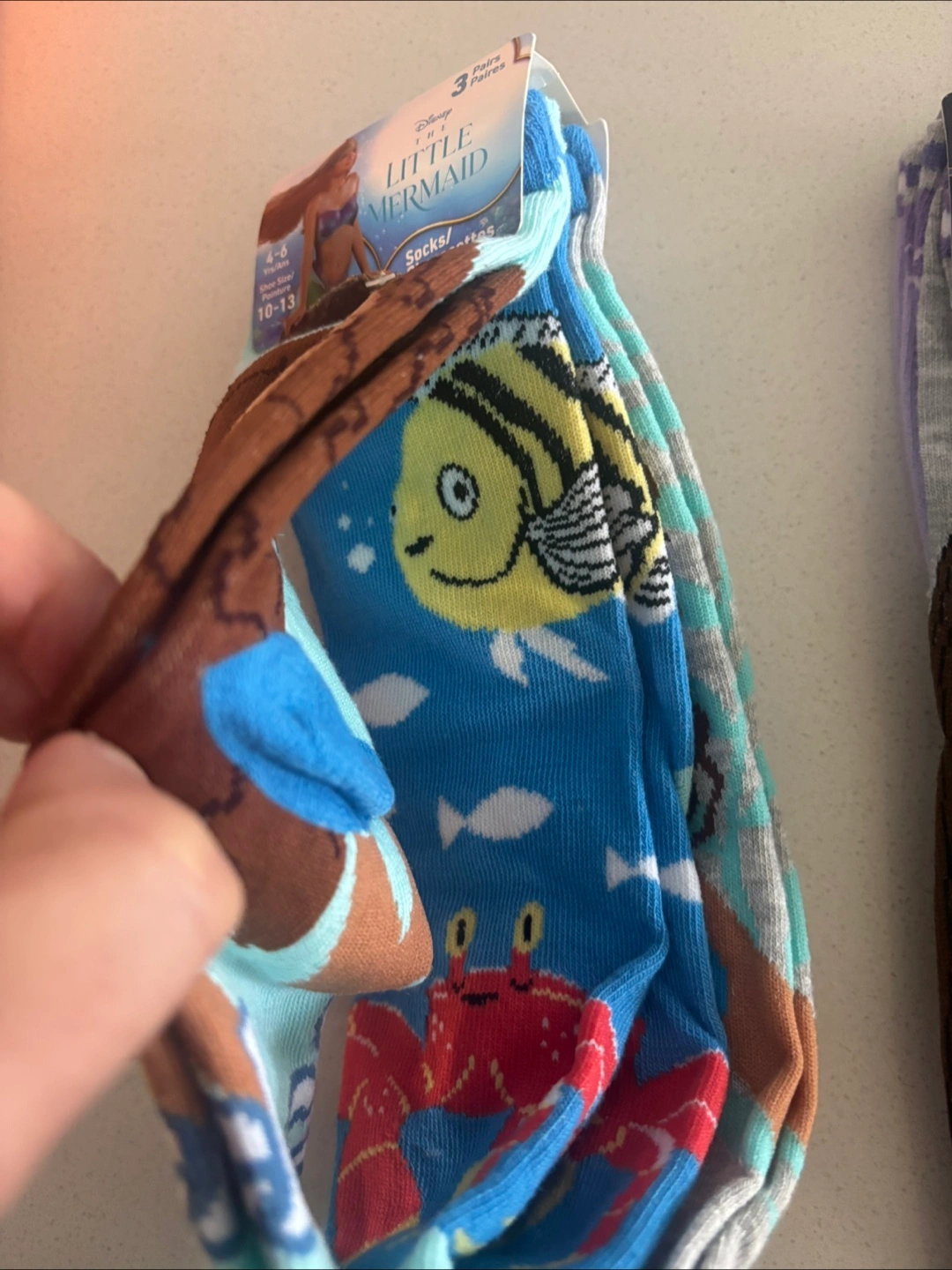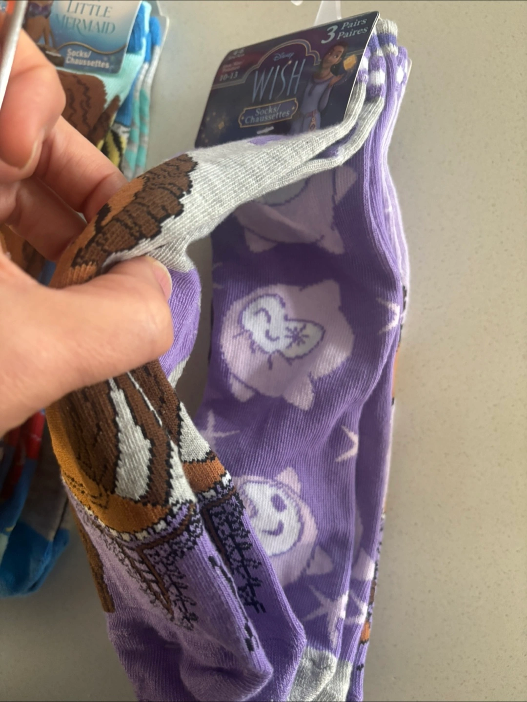Three pairs of Disney themed socks. Includes two pairs from The Little Mermaid and one pair featuring Asha from Wish. Sized for ages 4-6 years, shoe size 10-13. Perfect for young Disney fans!