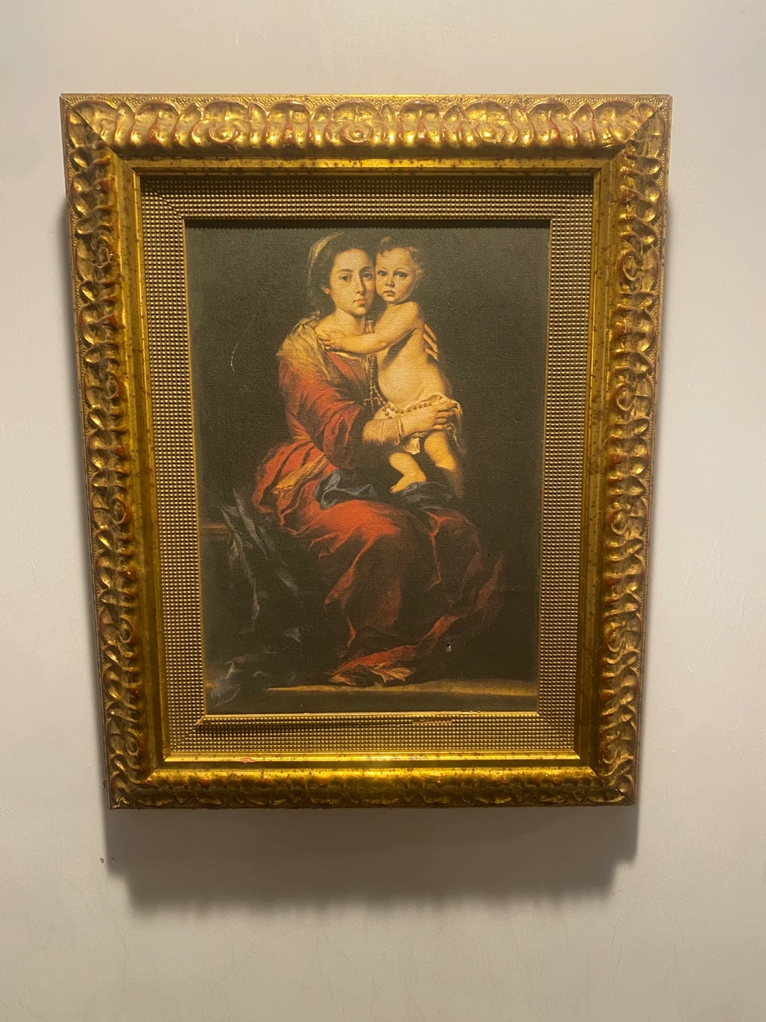 Add a touch of classic art to your home with this framed Madonna and Child painting. This is a used piece, but it is still in great condition with a beautiful, ornate gold frame.