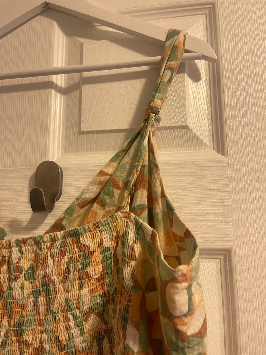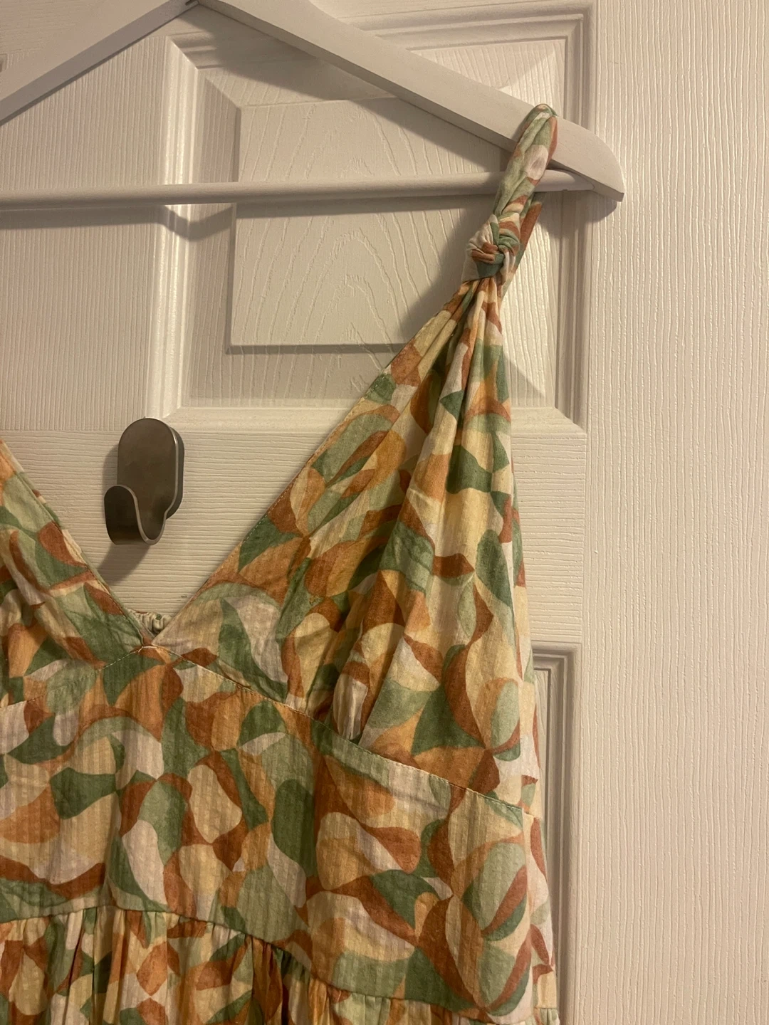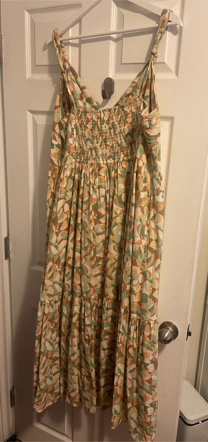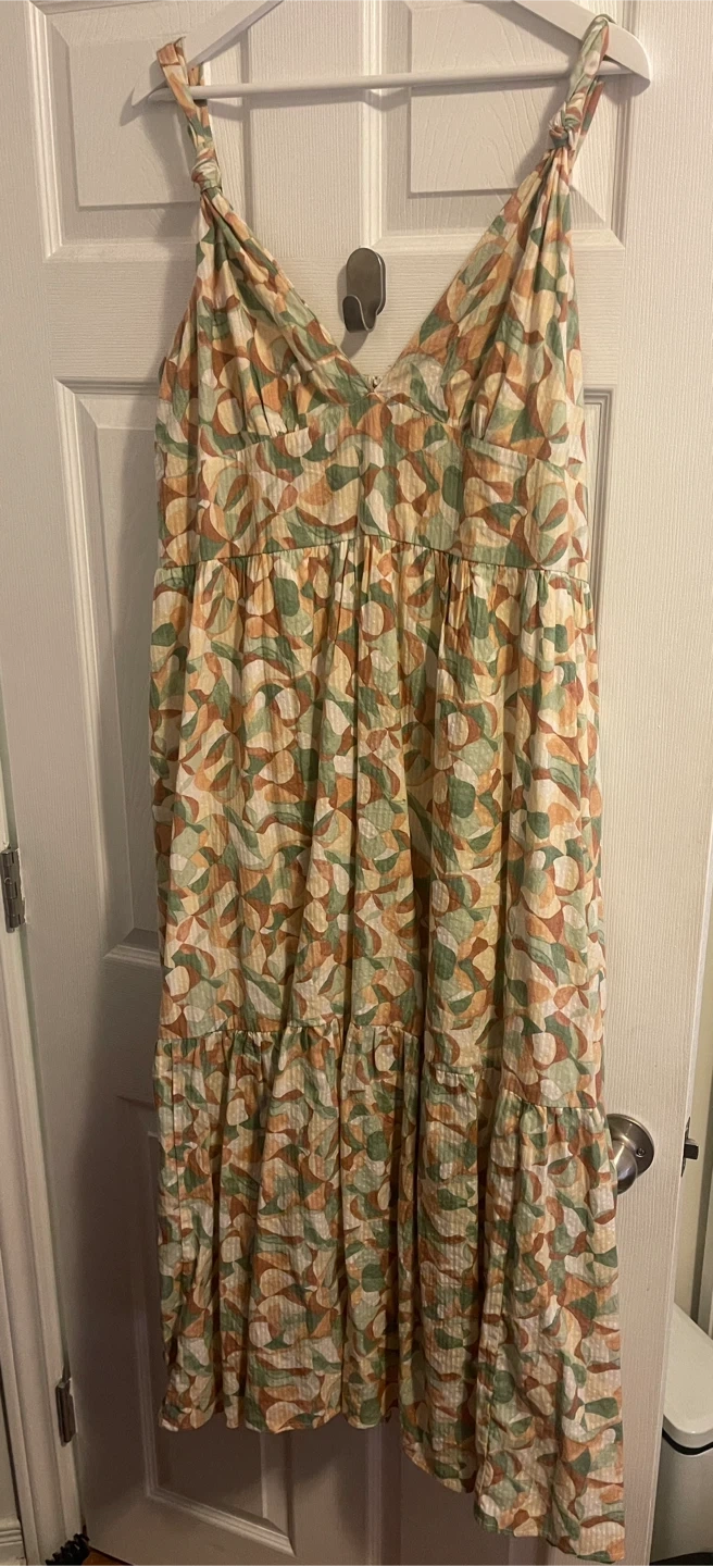 37This is a maxi dress from Abercrombie & Fitch. It features a tan, green, and white pattern. Perfect for summer! Originally purchased for $150.