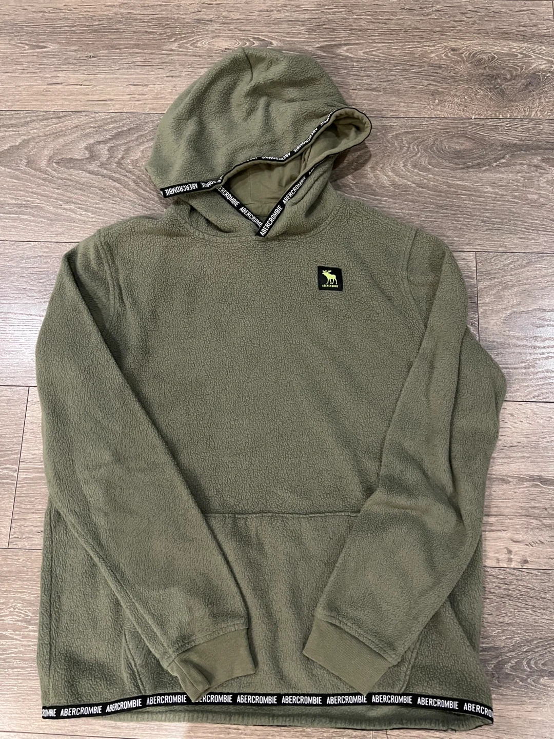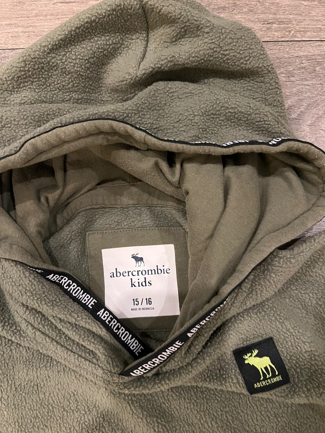 41Cozy Abercrombie Kids fleece hoodie in a nice olive green colour! The size is 15/16. It features a hood and a kangaroo pocket, perfect for keeping warm on chilly days