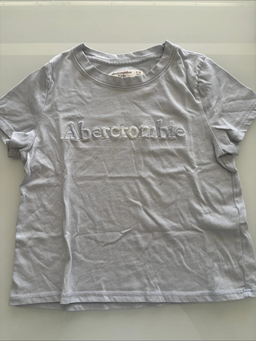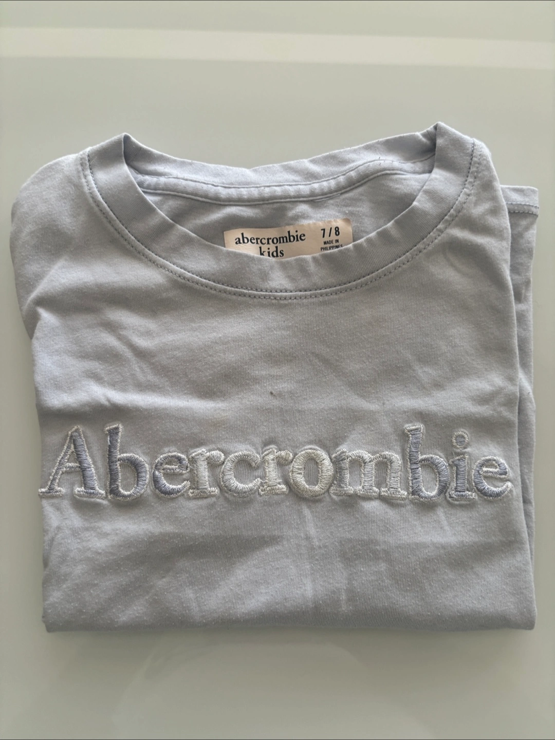 A cute Abercrombie Kids t-shirt in size 7/8! It's a light blue colour with the Abercrombie logo embroidered on the front. Perfect for your little one!