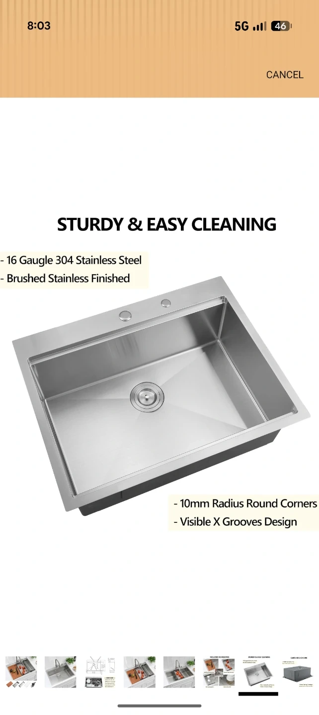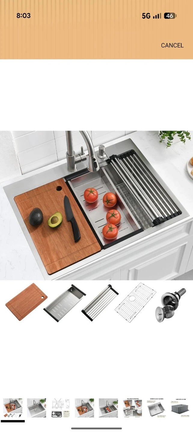 This is a new stainless steel kitchen sink with exterior dimensions of 28" x 22" and a 10" depth. It includes a solid wood cutting board, a colander with coin drain, a roll-up drying rack, and a bottom rinse grid. The sink features a cutout size of 27" L x 21" W.