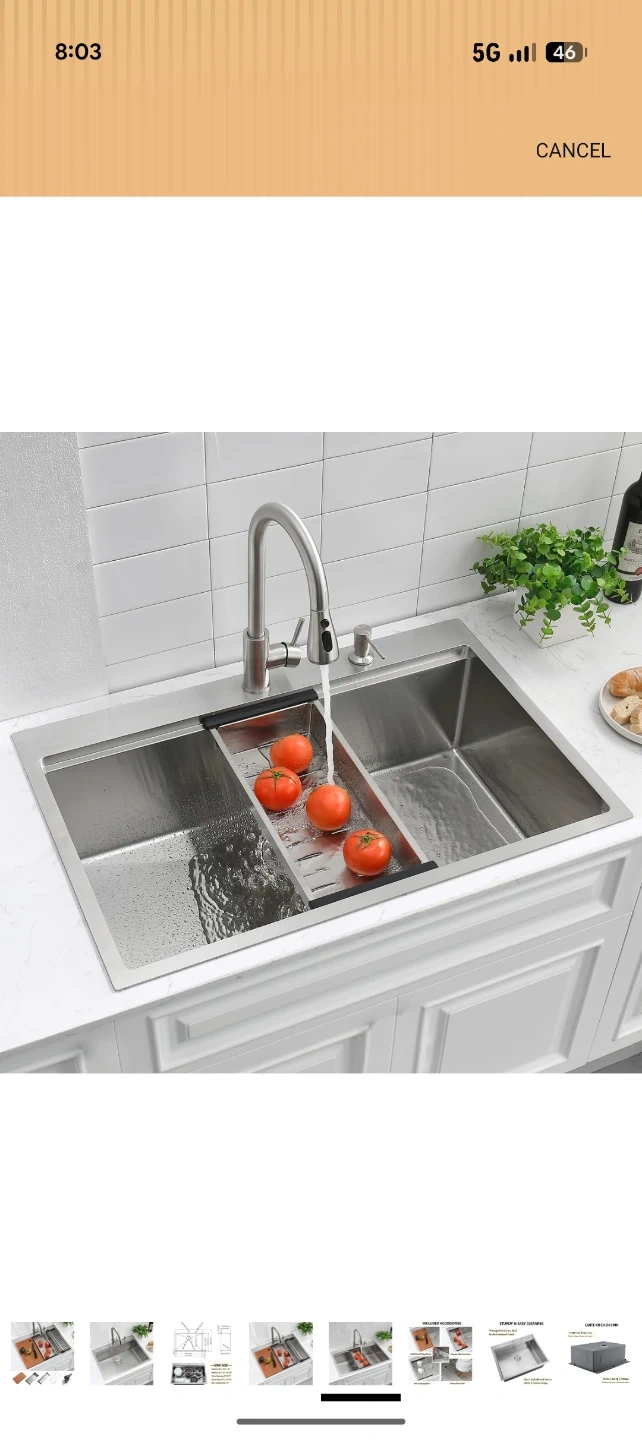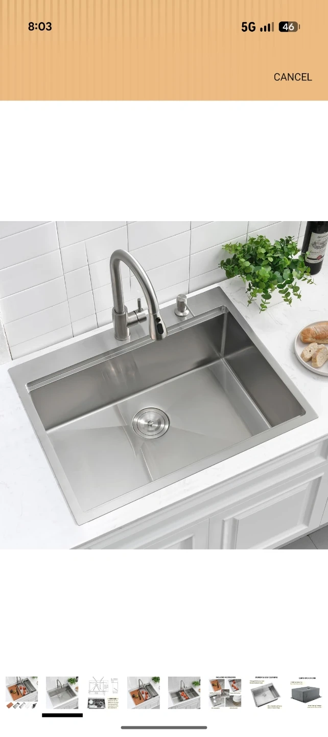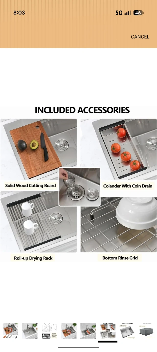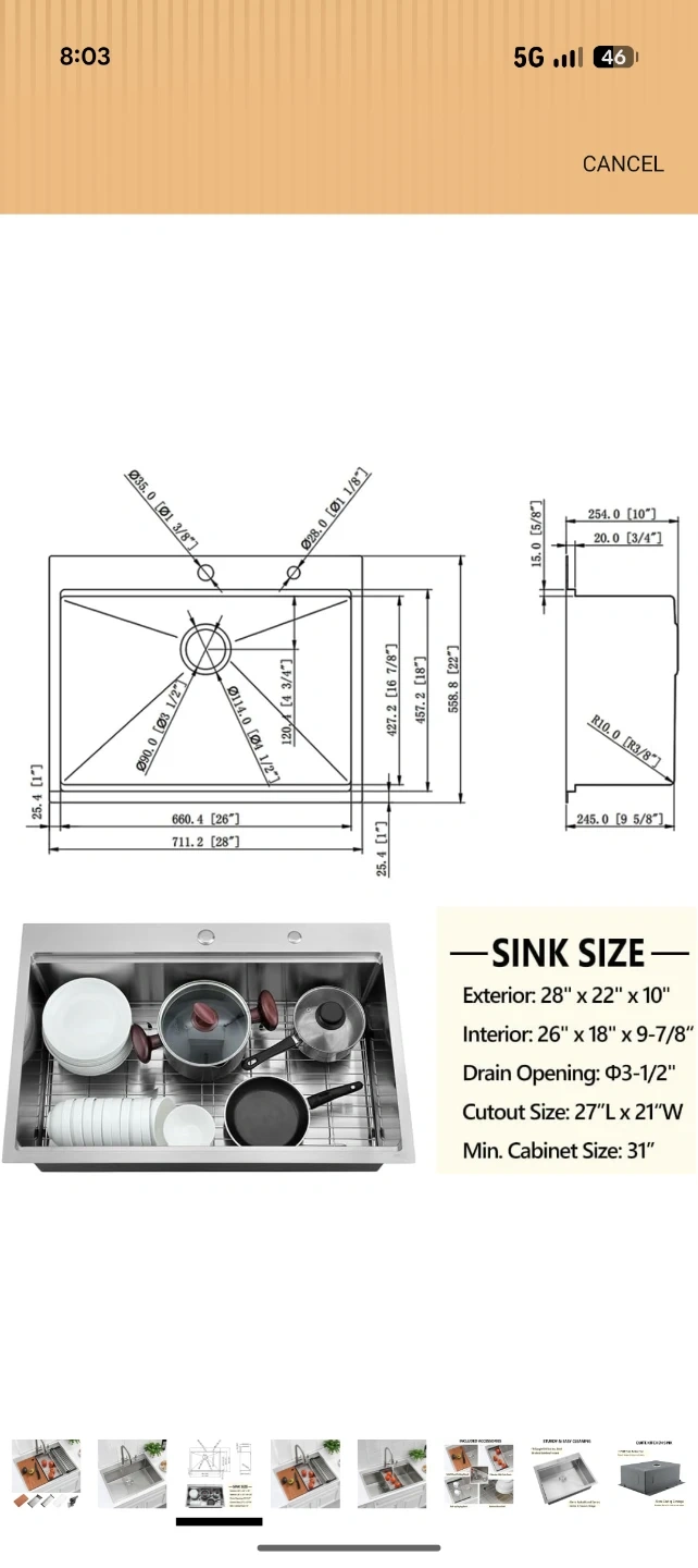 This is a new stainless steel kitchen sink with exterior dimensions of 28" x 22" and a 10" depth. It includes a solid wood cutting board, a colander with coin drain, a roll-up drying rack, and a bottom rinse grid. The sink features a cutout size of 27" L x 21" W.
