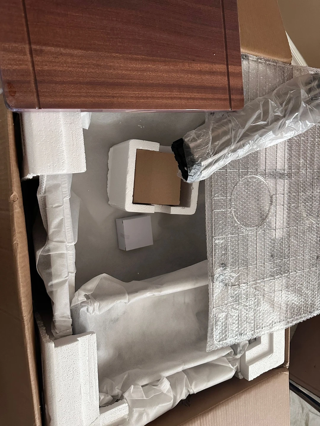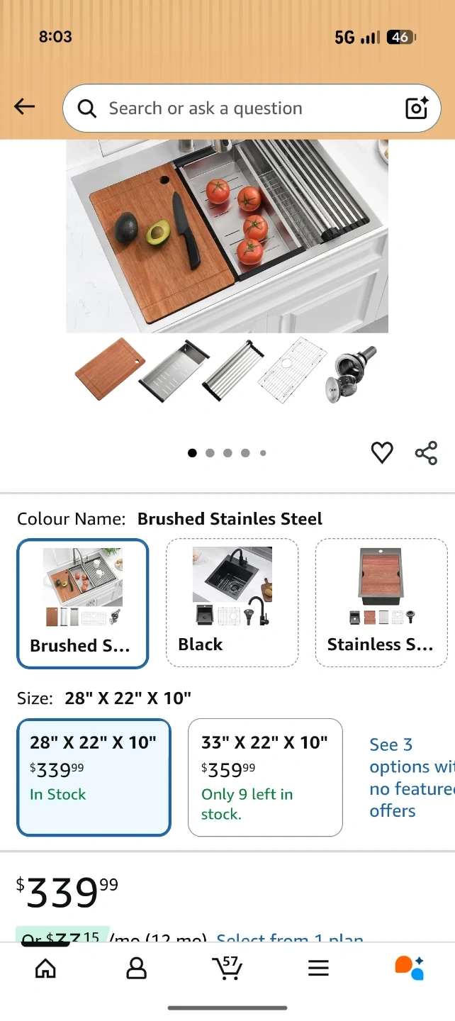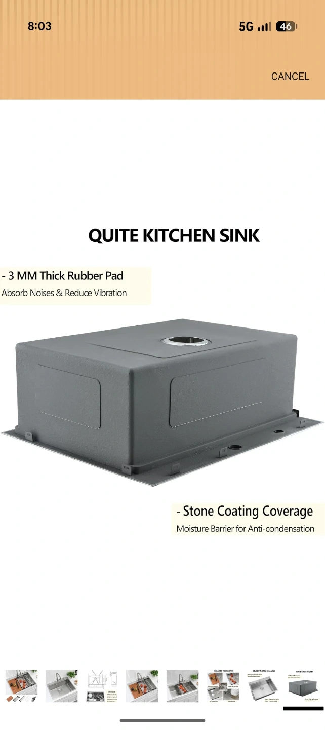 This is a new stainless steel kitchen sink with exterior dimensions of 28" x 22" and a 10" depth. It includes a solid wood cutting board, a colander with coin drain, a roll-up drying rack, and a bottom rinse grid. The sink features a cutout size of 27" L x 21" W.