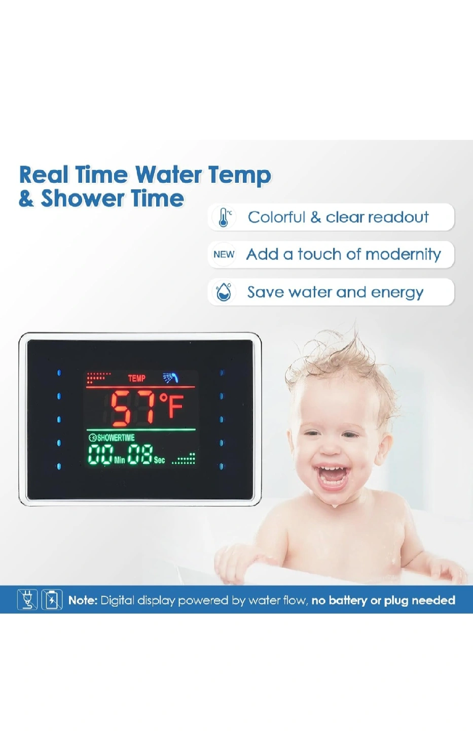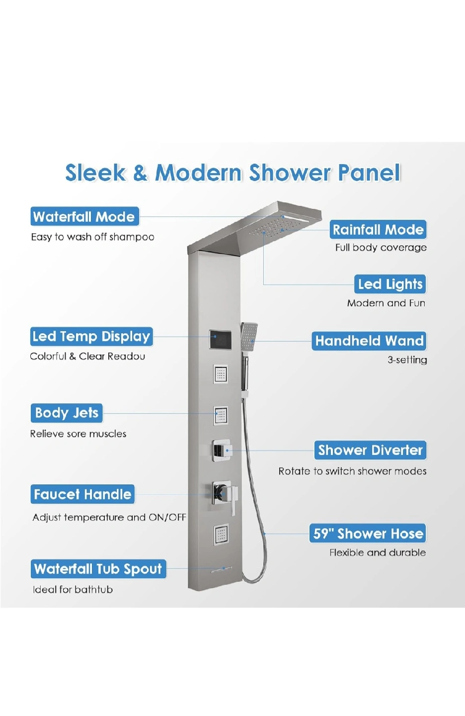 This sleek and modern shower panel is designed to elevate your bathroom experience! It features a waterfall mode for easy shampoo rinsing and a rainfall mode for full body coverage. Enjoy the colourful LED temperature display and the convenience of a 3-setting handheld wand. The body jets offer a soothing massage, and the faucet handle allows you to easily adjust the temperature. The 59" shower hose is both flexible and durable