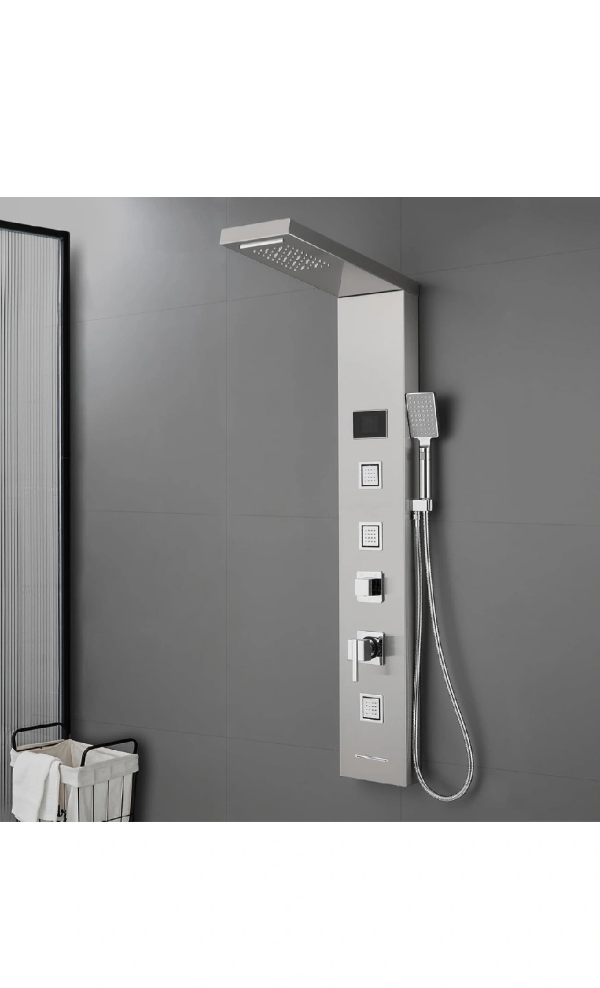 This sleek and modern shower panel is designed to elevate your bathroom experience! It features a waterfall mode for easy shampoo rinsing and a rainfall mode for full body coverage. Enjoy the colourful LED temperature display and the convenience of a 3-setting handheld wand. The body jets offer a soothing massage, and the faucet handle allows you to easily adjust the temperature. The 59" shower hose is both flexible and durable
