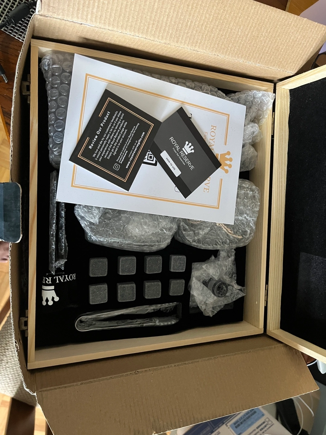 Selling a brand new Royal Reserve Whiskey Decanter Set. It comes complete in its original wood box and includes: