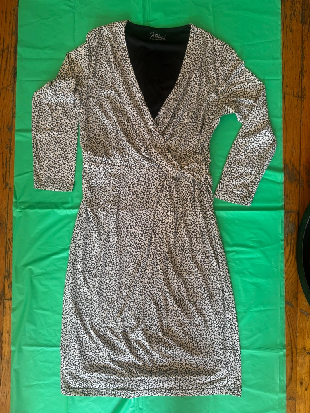 Este vestido cruzado Velucci presenta un estampado abstracto en blanco y negro. Es una talla S con mangas 3/4 y un favorecedor escote cruzado. La tela tiene una bonita cortina para mayor comodidad. Llévalo $8