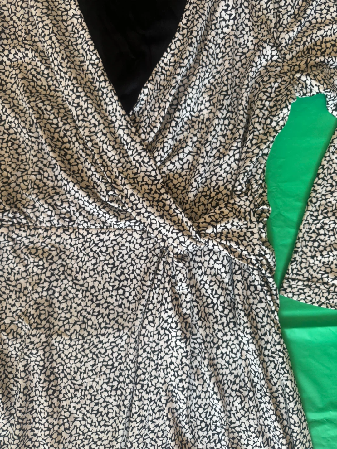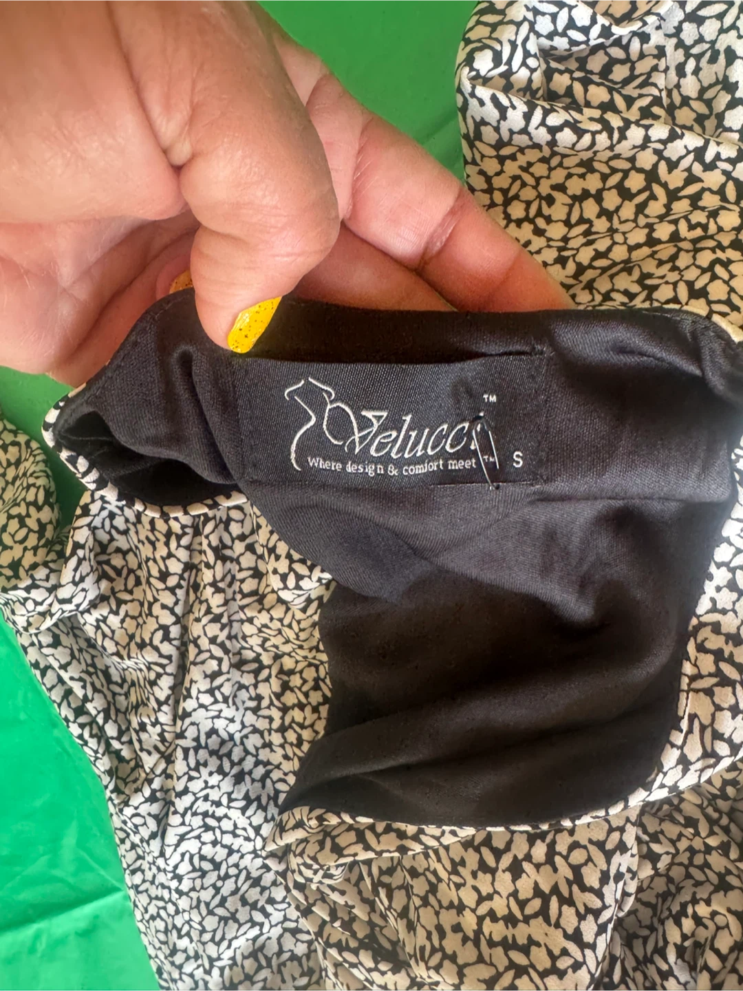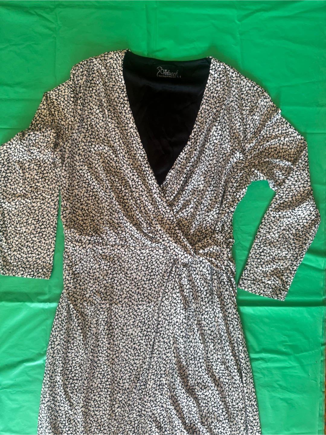Este vestido cruzado Velucci presenta un estampado abstracto en blanco y negro. Es una talla S con mangas 3/4 y un favorecedor escote cruzado. La tela tiene una bonita cortina para mayor comodidad. Llévalo $8