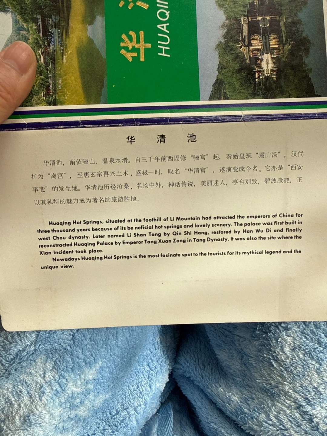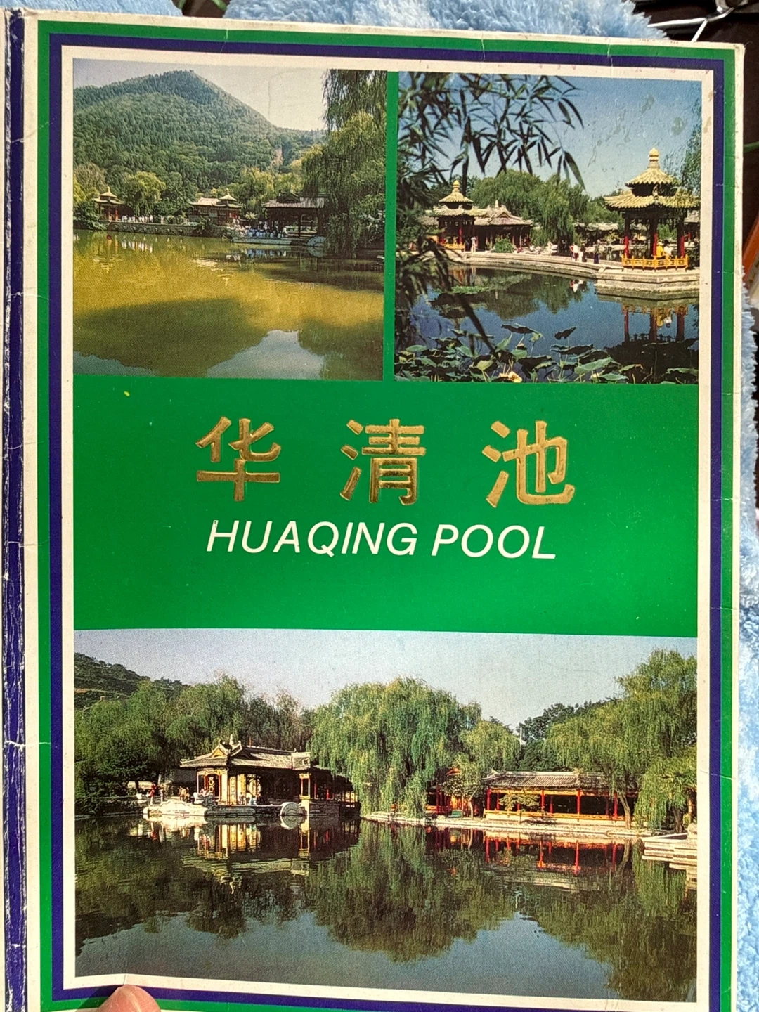 This is a set of postcards featuring Huaqing Pool, also known as Huaqing Palace. The postcards display scenic views of the historical site, including its gardens and traditional architecture. A map of tourist attractions in Xi'an is also included.