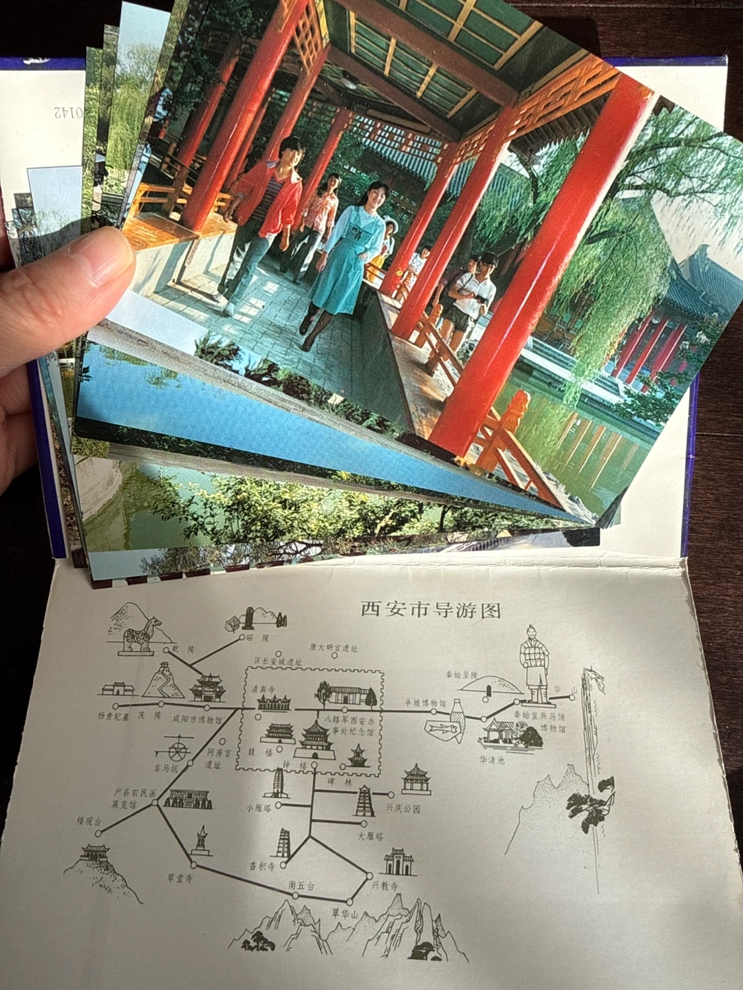 This is a set of postcards featuring Huaqing Pool, also known as Huaqing Palace. The postcards display scenic views of the historical site, including its gardens and traditional architecture. A map of tourist attractions in Xi'an is also included.