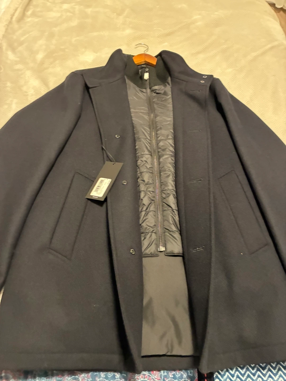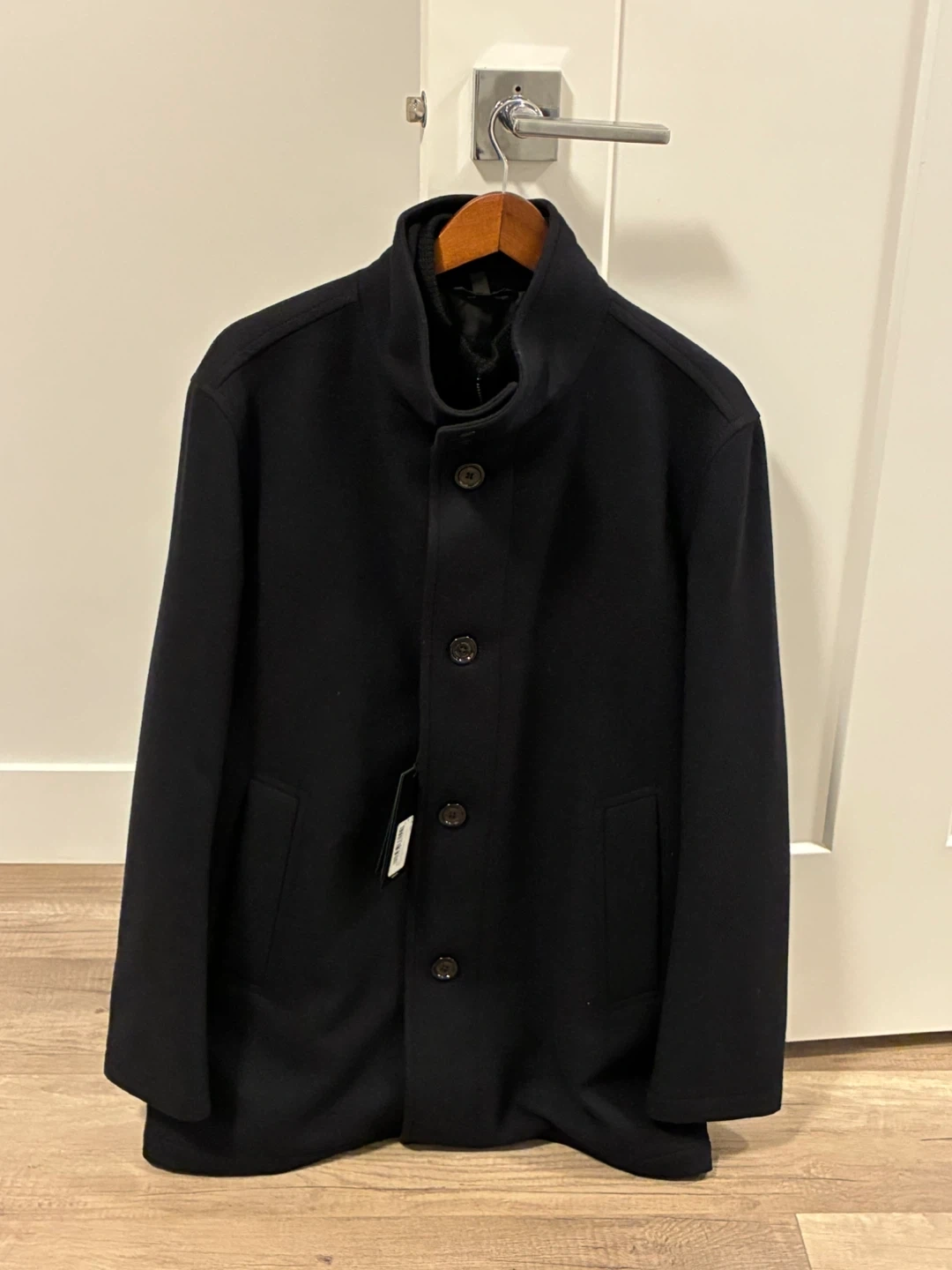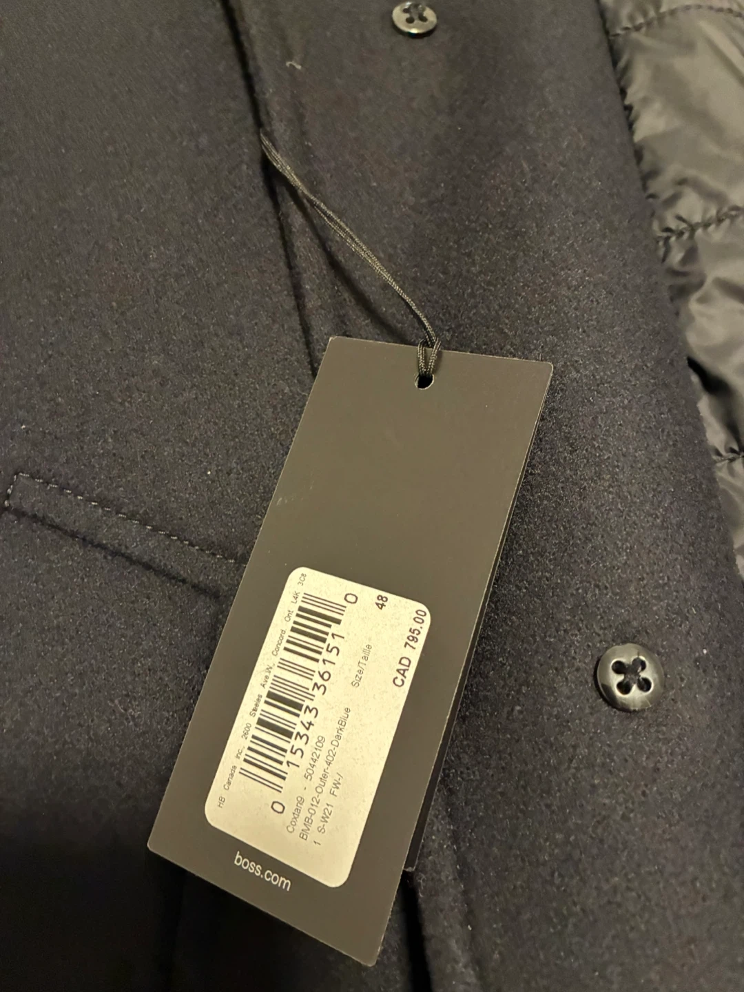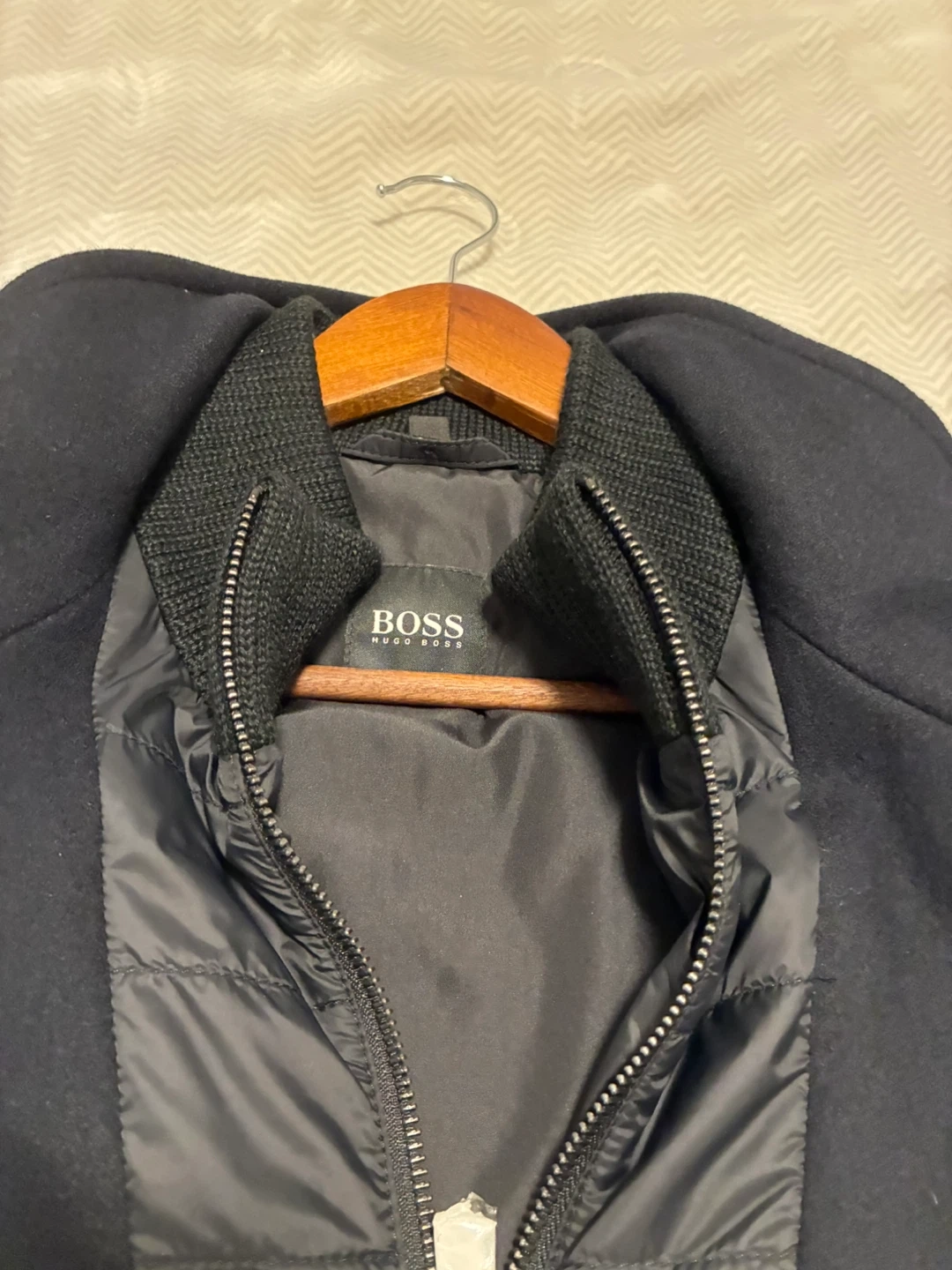 Hugo Boss black wool blend jacket with a quilted inner layer. It features a full zip and button closure. Size 48.