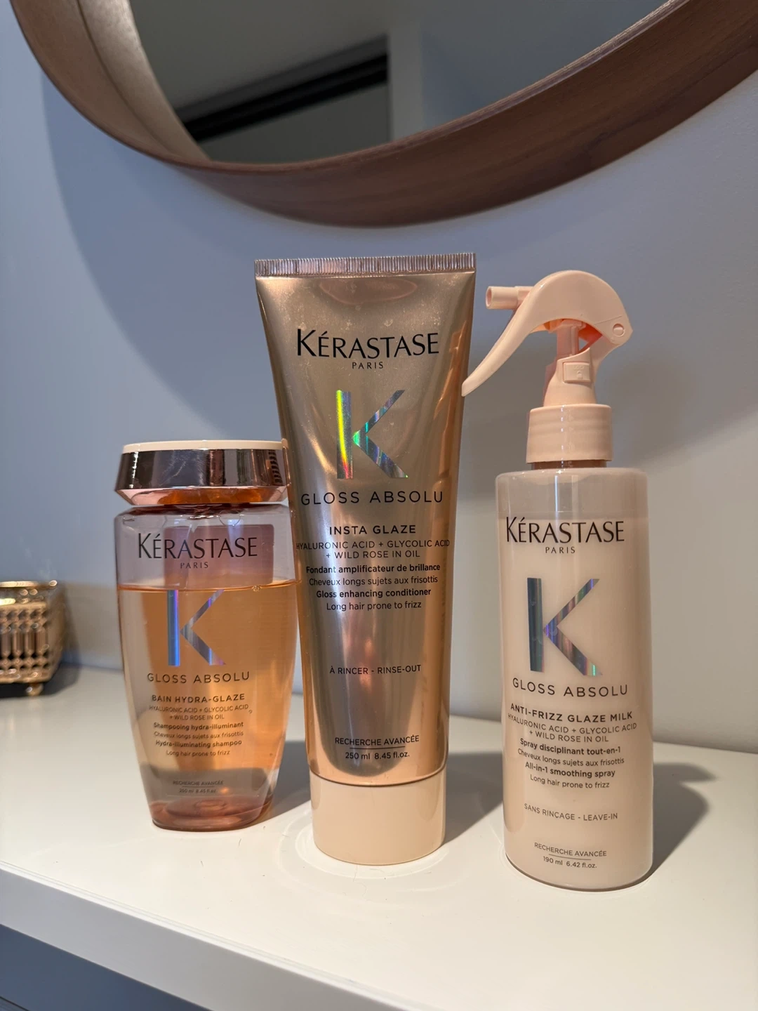 Kérastase Gloss Absolu Hydra-Glaze shampoo (250 ml), Insta-Glaze conditioner (250 ml), and Anti-Frizz Glaze Milk leave-in spray (190 ml). All products are formulated with Hyaluronic Acid, Glycolic Acid, and Wild Rose in Oil to enhance shine and tame frizz. Designed for long hair prone to frizz.