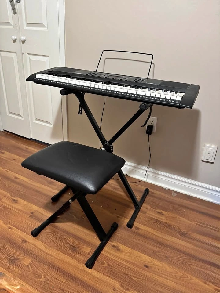 61 responsive piano-style keys with built-in speakers. Perfect for practicing and performing. Features 300 built-in tones with layer and split modes, and 300 built-in rhythms. Play along with 40 demo songs or record your own. Includes an easy-to-assemble stand, a bench with three adjustable height settings, and a power adapter.