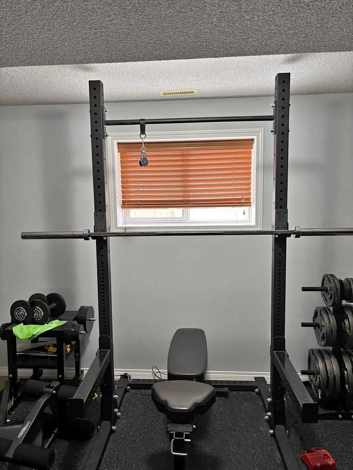 Includes: Squat Stand ($709 new) https://www.roguecanada.ca/sml-2-rogue-90-monster-lite-squat-stand , Safety spotter arms ($267 new), Pulley system.