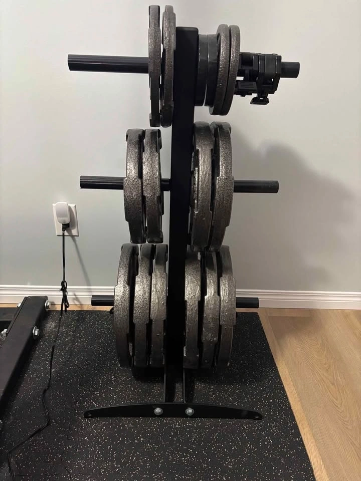 Includes: 6x45lbs, 2x35lbs, 2x25lbs, 2x10lbs, 2x5lbs, weight storage rack, barbell, and collars.
