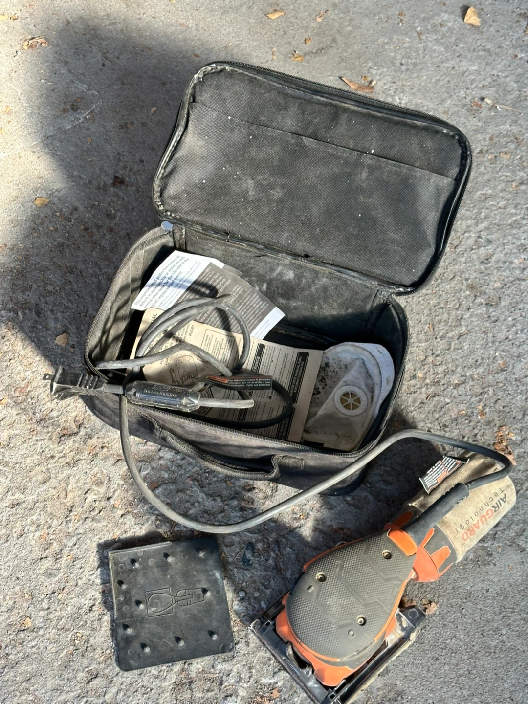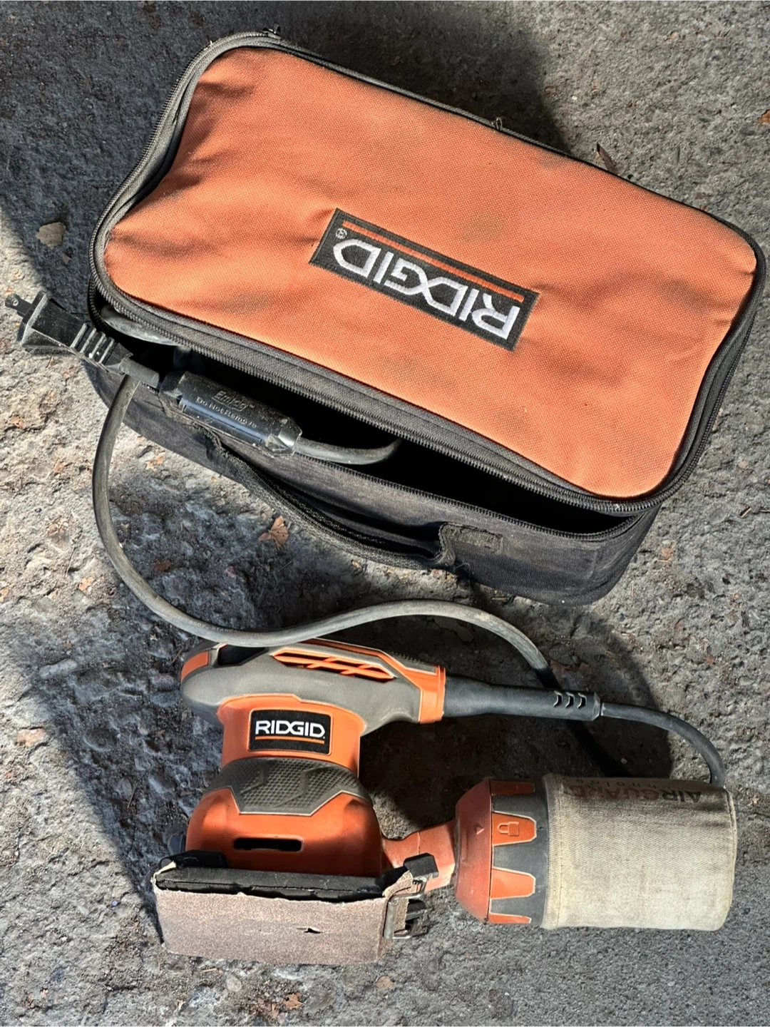 Power tool for sale! RIDGID random orbital sander for woodworking projects. Includes dust bag and carrying case. This tool's compact design makes it easy to handle for various sanding tasks.