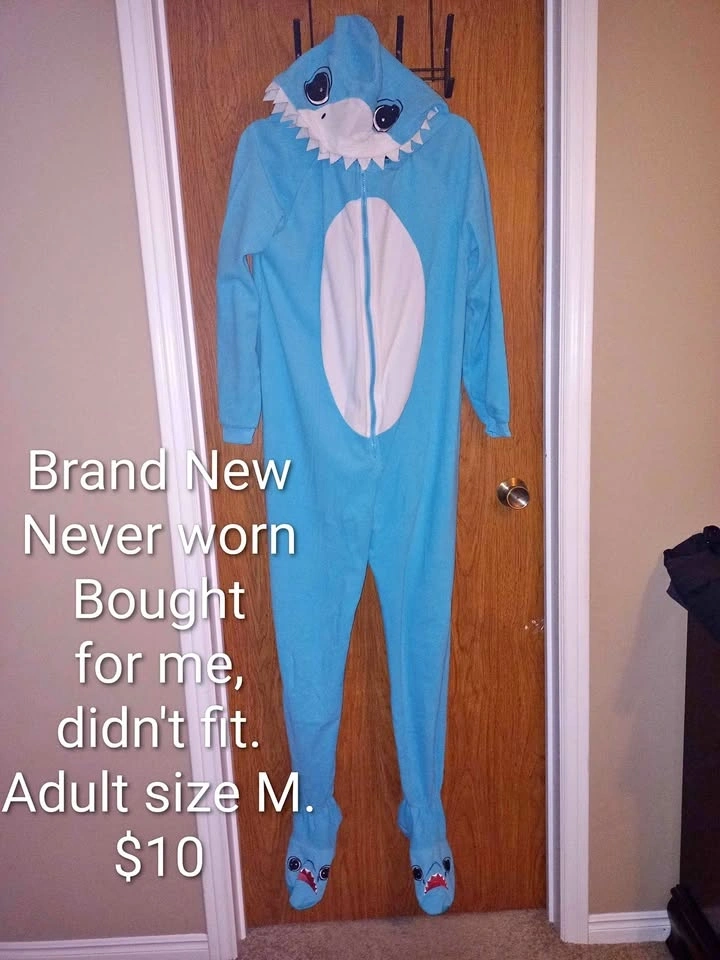 Buy & SellWoman's M Shark OnesieWoman's M Shark Onesie$10Bought for me but didn't fit so I never wore it. Closet clean out time. Check out my other adds for other new or like new woman's clothes.WHERE TO MEETCheck LocationView MapSELLERCassandraWinona211 review0 chats·0 favorites·0 viewsSEND CHAT TO SELLERHi Cassandra! I’m interested in your listing.Hi Cassandra! I’m interested in your listing.Get the Karrot app to chatSign In to chat