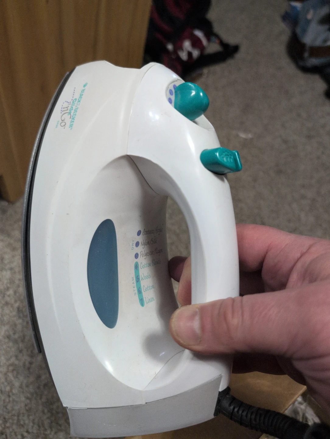 This is a BLACK+DECKER Glide & Go iron. It has settings for different fabric types including acetate/nylon, silk, polyester/rayon, cotton blends, wools, cotton, and linen. It also has steam and dry settings available.