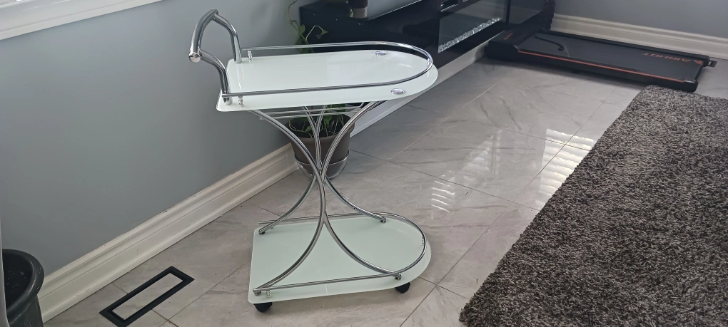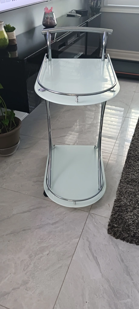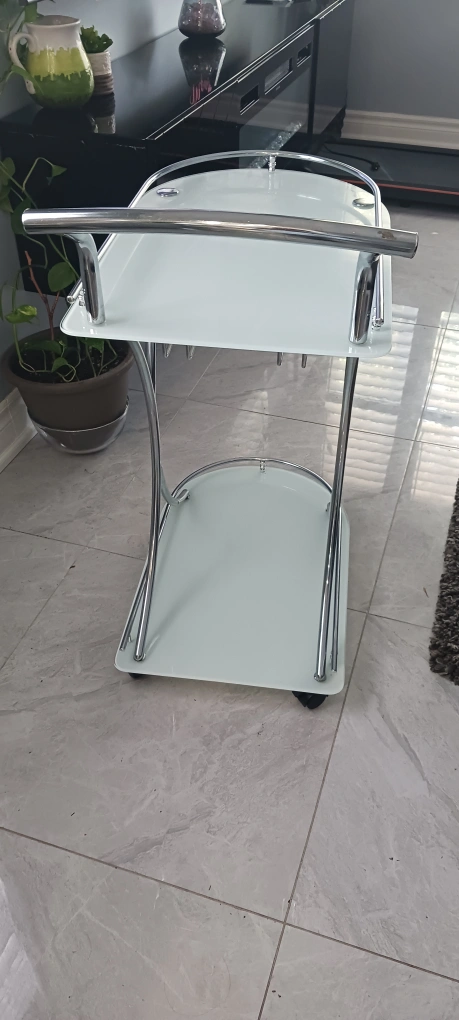 Selling a stylish serving cart with a glass top and chrome frame! It's perfect for serving drinks or snacks, or as a decorative piece in your living room or dining area. It's in great condition and ready for a new home