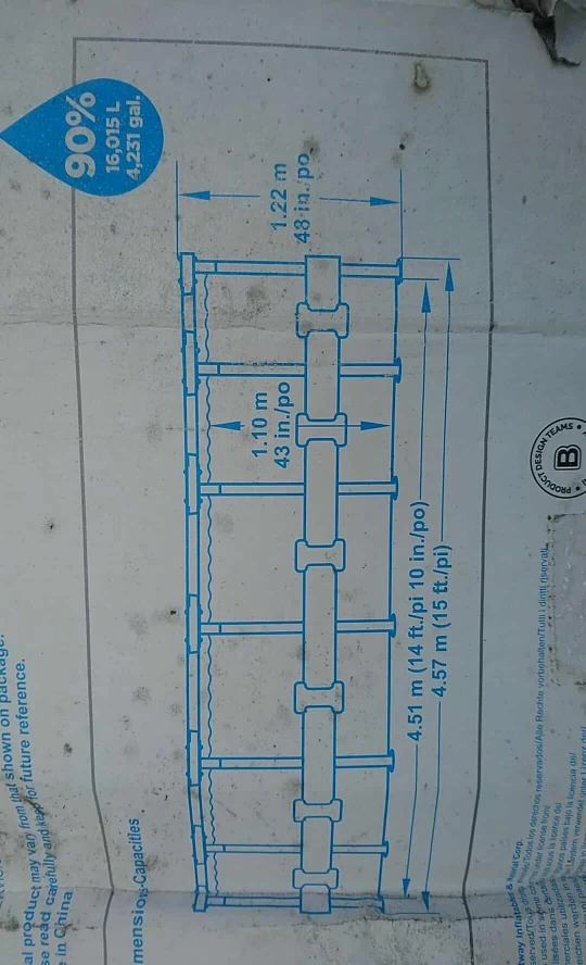 Selling an above ground swimming pool with a capacity of 16,015liters (4,231 gallons). Dimensions are approximately 4.51m (15 ft) in length and 1.22m (48 in) in height. Perfect for summer fun!