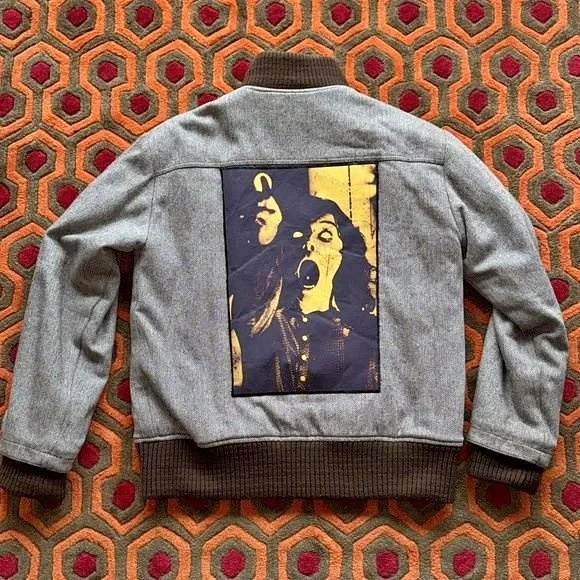 This is a pre-owned military style Ben Sherman herringbone-patterned jacket. It is still in good condition. This is a warm wool jacket. The back has a very large horror movie patch that was hand-sewn on. The patch is based on the horror movie, Invasion of the Body Snatchers. Measurements are included in the listing photos. The Jacket is brown and tan, the patch is yellow. PICK UP YONGE & SHEPPARD