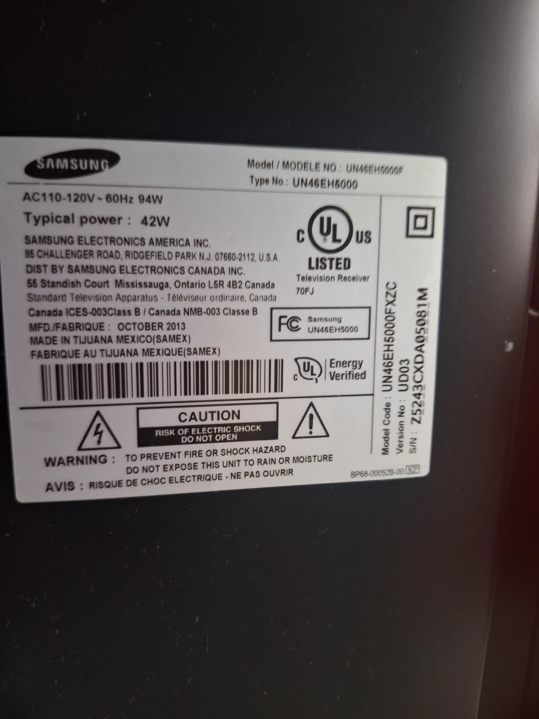 This is a Samsung UN46EH6000 46-inch Smart LED TV. It offers HDMI and USB inputs. Manufactured in October 2013.