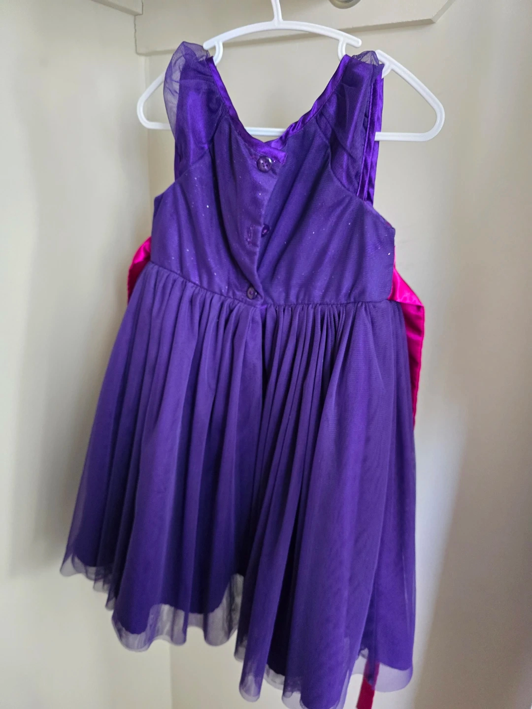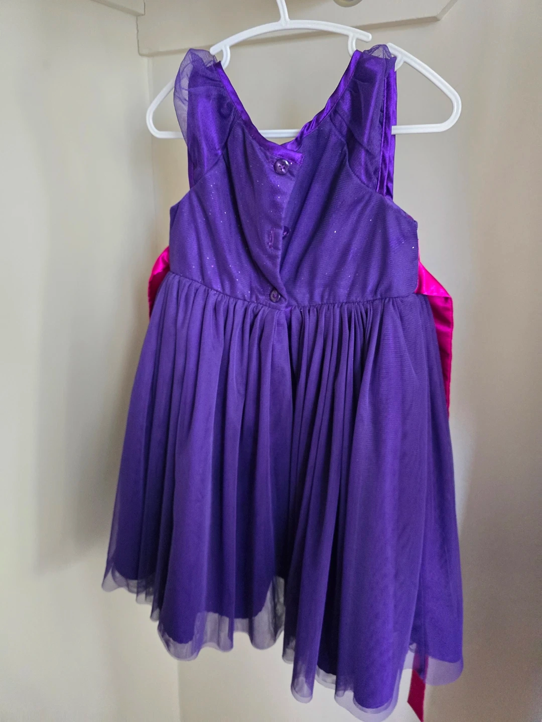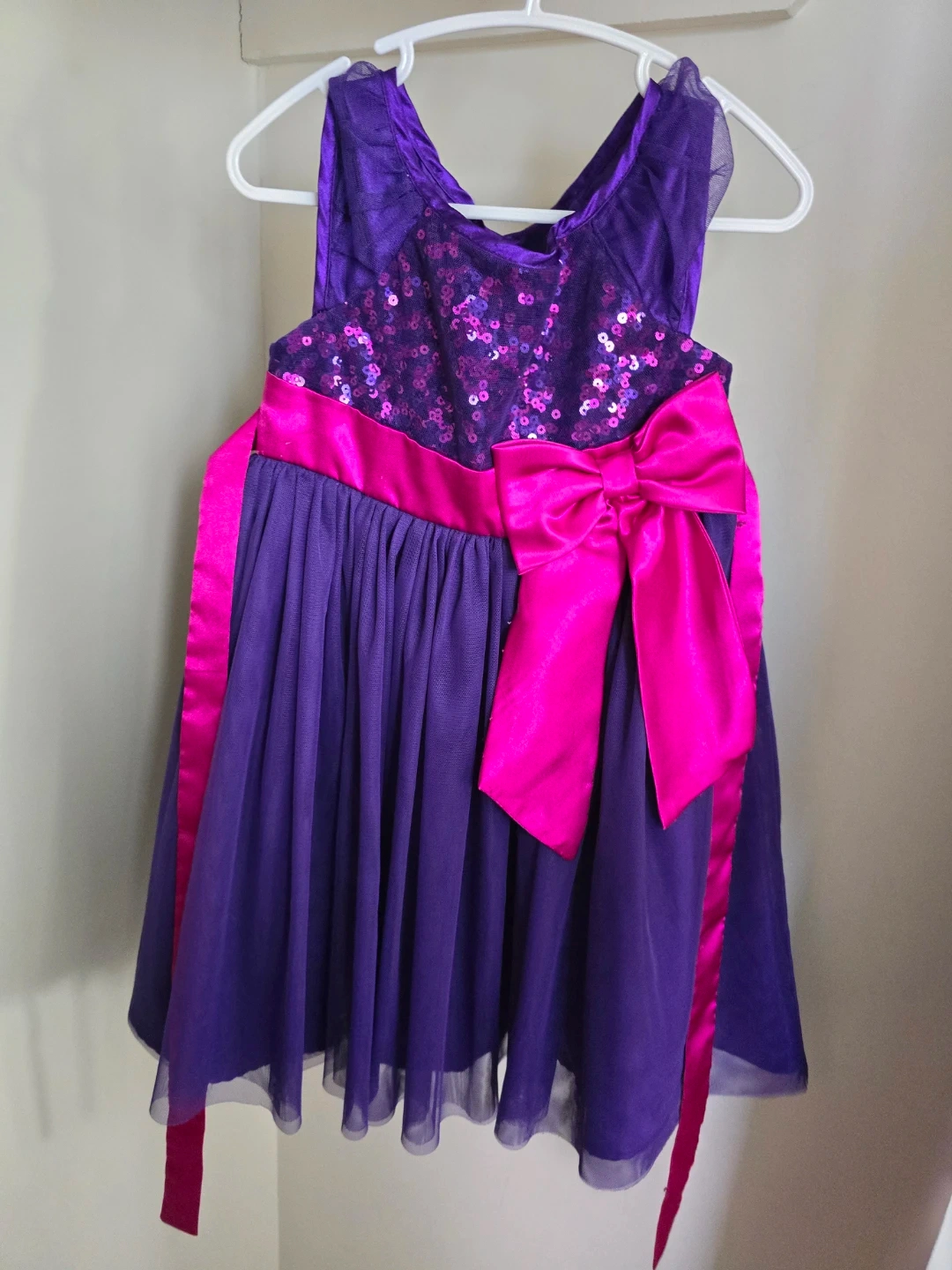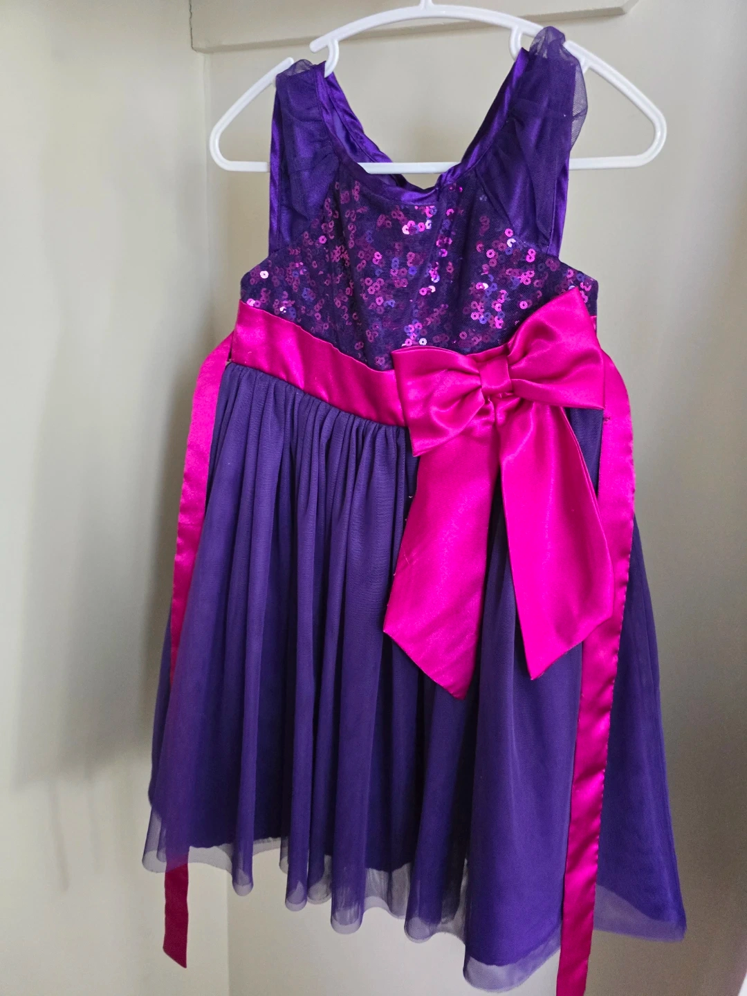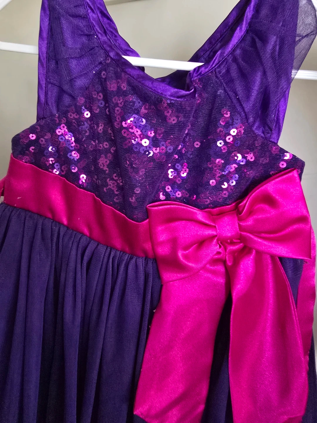 A cute purple dress with a sequin top and a bright pink bow! Perfect for parties or special occasions. It's in great condition and ready for a new adventure!