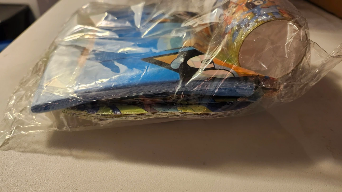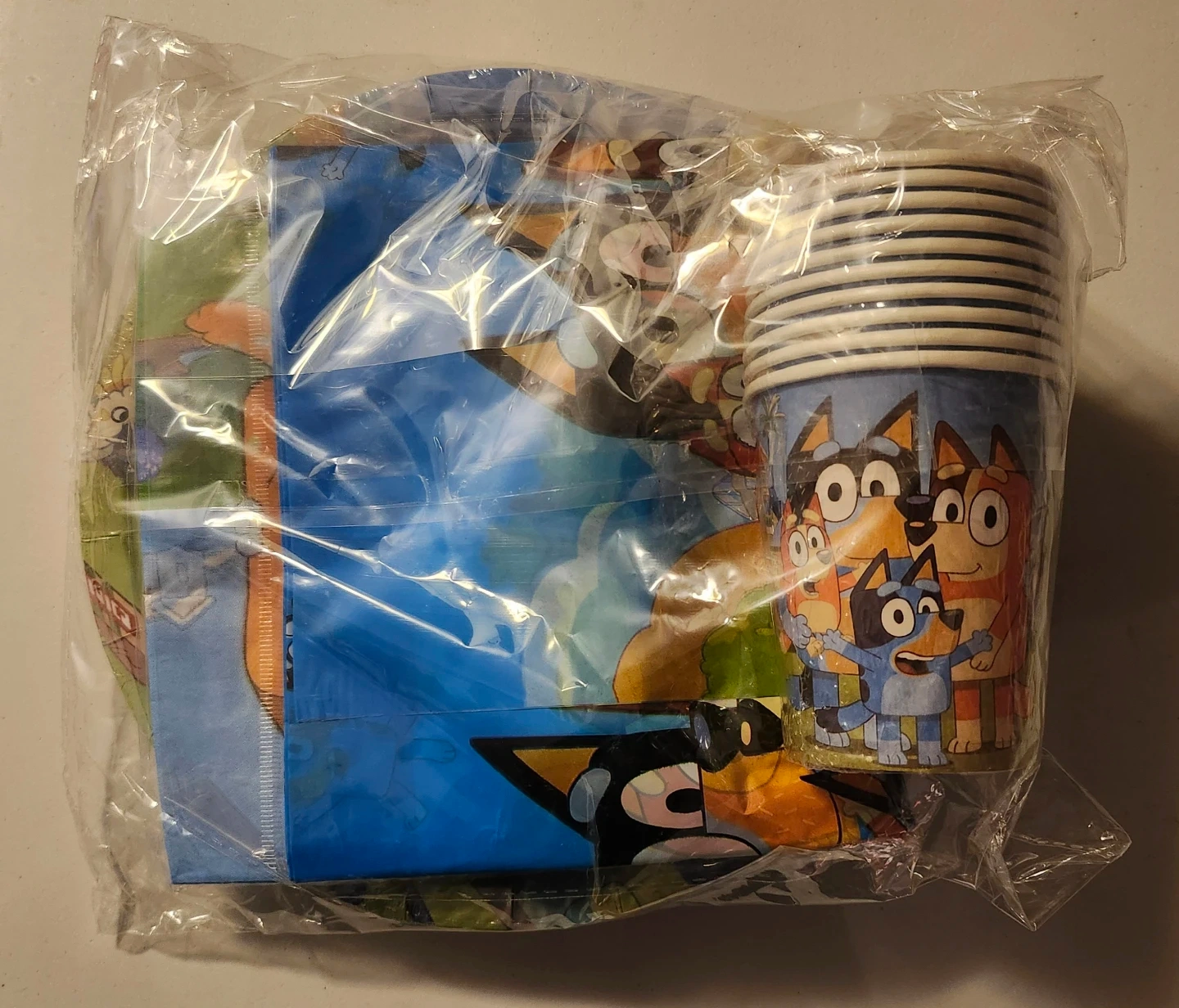 A party pack featuring Bluey characters, including plates and cups. Perfect for a Bluey-themed birthday celebration!
