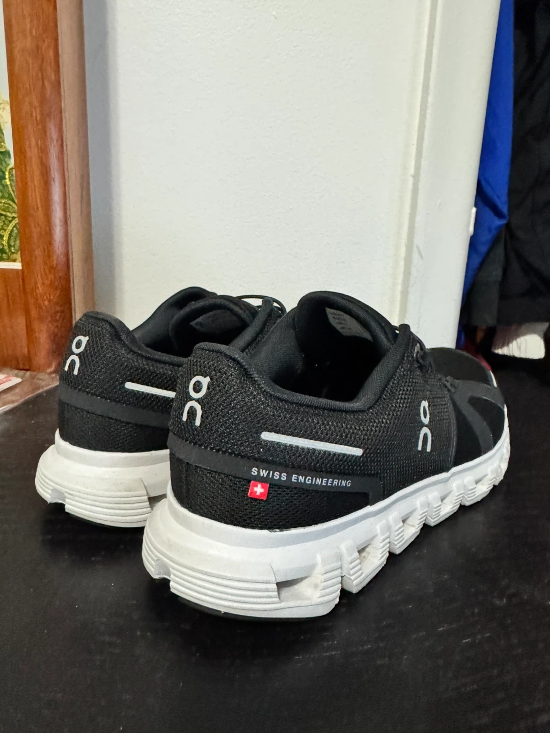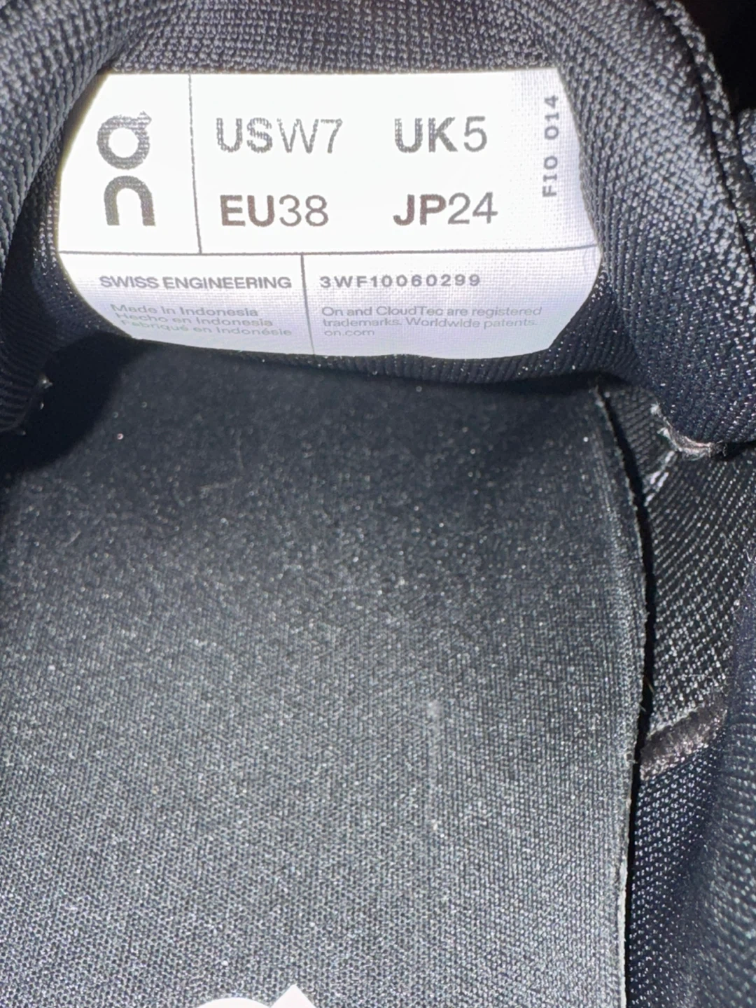 Black On running shoes with white accents. Features "Swiss Engineering" detail. Made in Indonesia. US Women's size 7, UK 5, EU 38, JP 24.