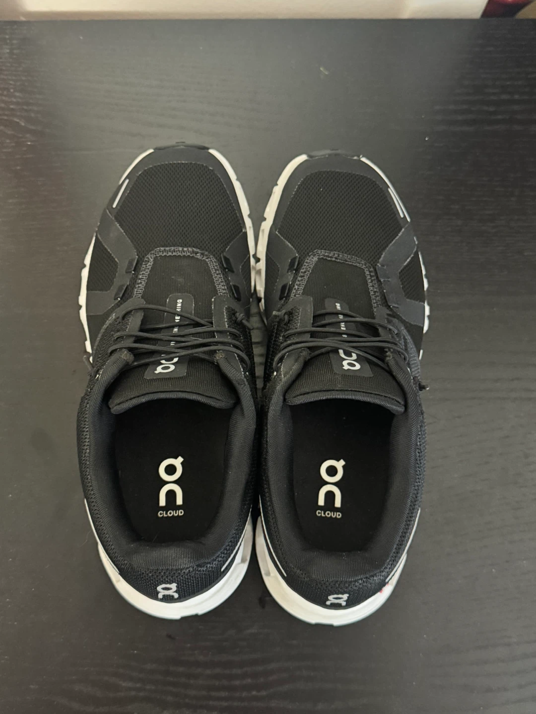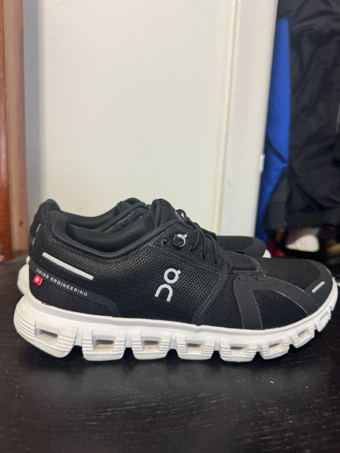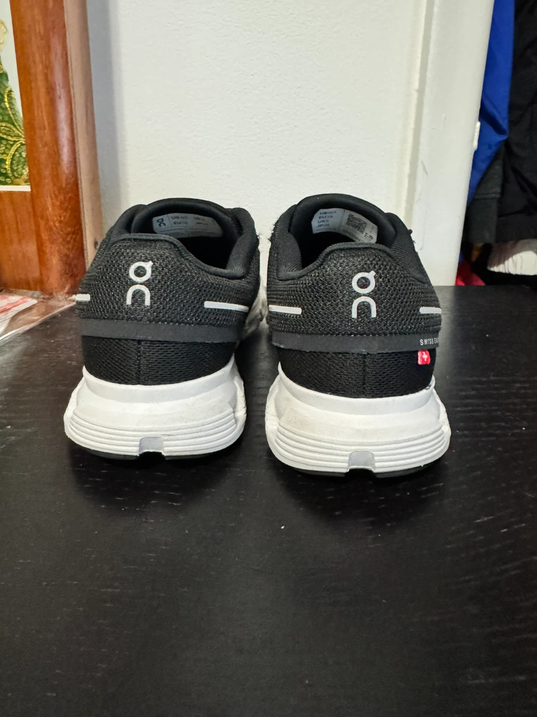 Black On running shoes with white accents. Features "Swiss Engineering" detail. Made in Indonesia. US Women's size 7, UK 5, EU 38, JP 24.