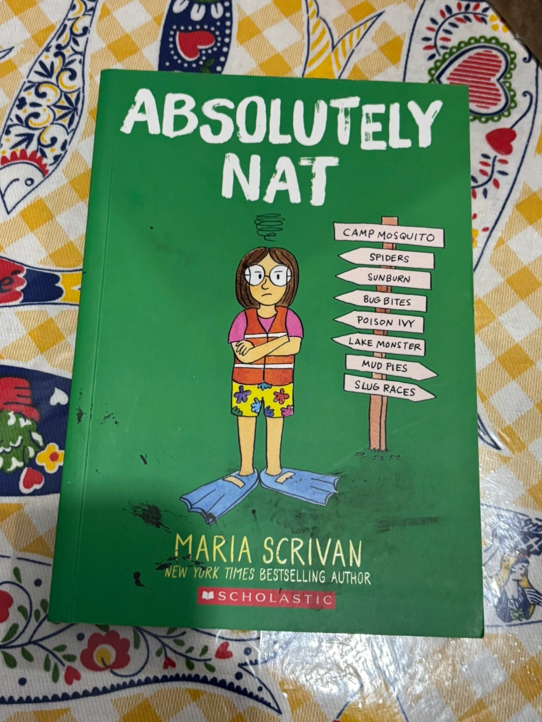 A children's novel, in paperback, about a young girl named Nat. The book cover is green with a picture of Nat on the cover wearing a life jacket, flippers, and shorts. There are also signs on the cover with words like "Camp Mosquito" and "Spider" on them. The book is published by Scholastic. In like new condition with some marker smudges at the front