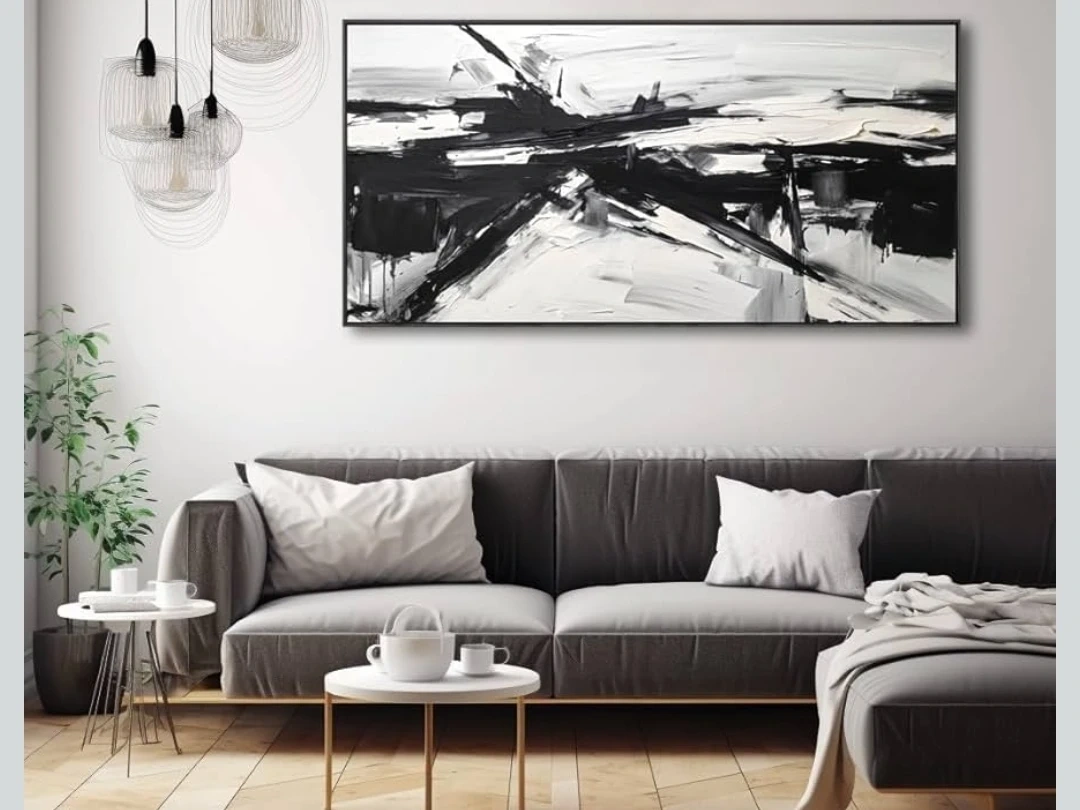 49Selling a striking abstract canvas art piece in black and white. It's sized at 60x120, making it a great statement piece for any room. The artwork is NEW and ready to hang! 2 Available
