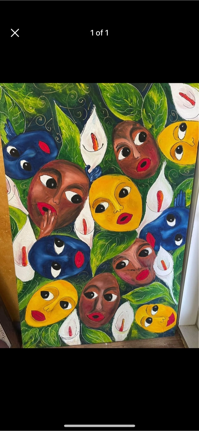 This is a unique and colourful painting featuring abstract faces and flowers.