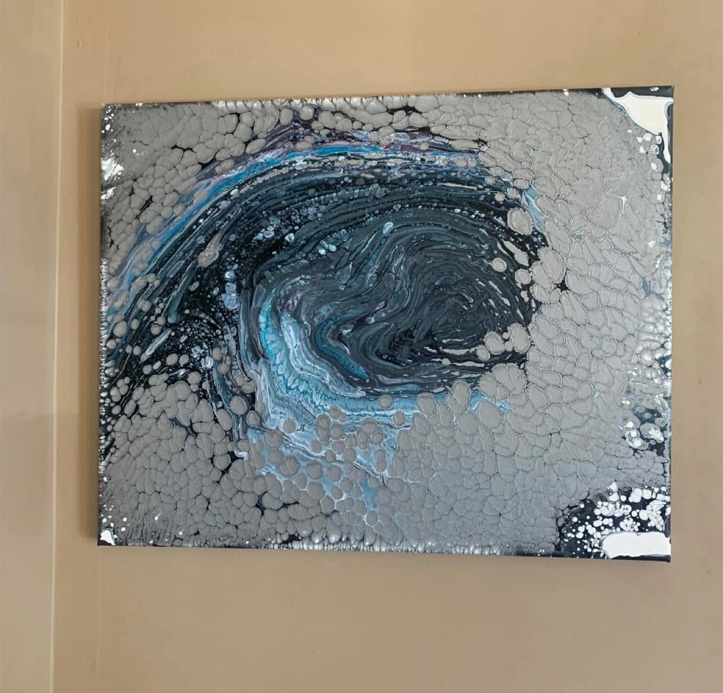 55Beautiful original handmade artwork. Features swirling blues, greys and silvers. Canvas acrylic painting. Comes with certificate of authenticity. Unique piece for home décor ready to hang. Artist willing to deliver locally, cash only.