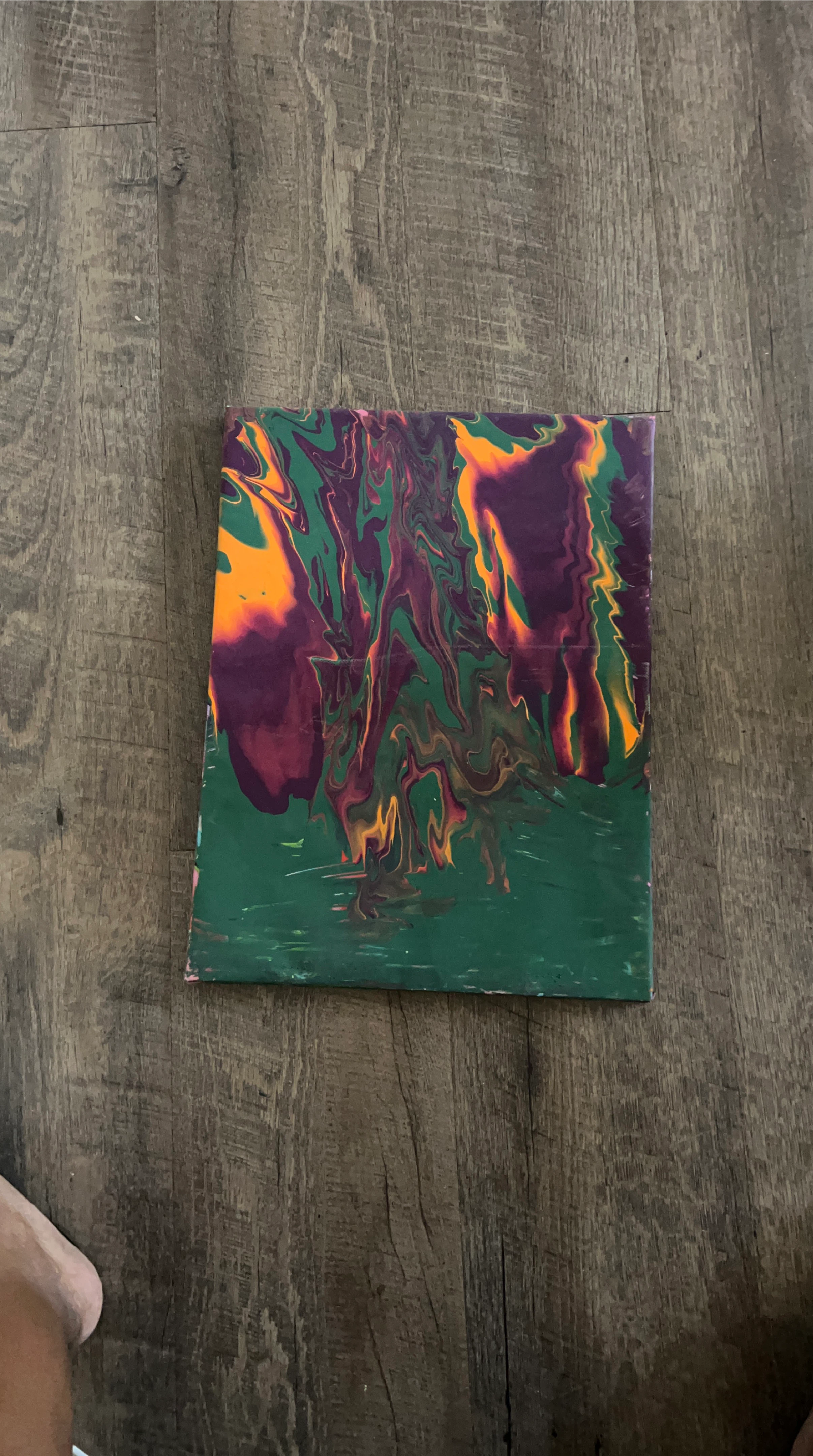 87Unique abstract painting with a fluid art style, featuring swirls of green, orange, and purple. Adds a vibrant touch to any room!
