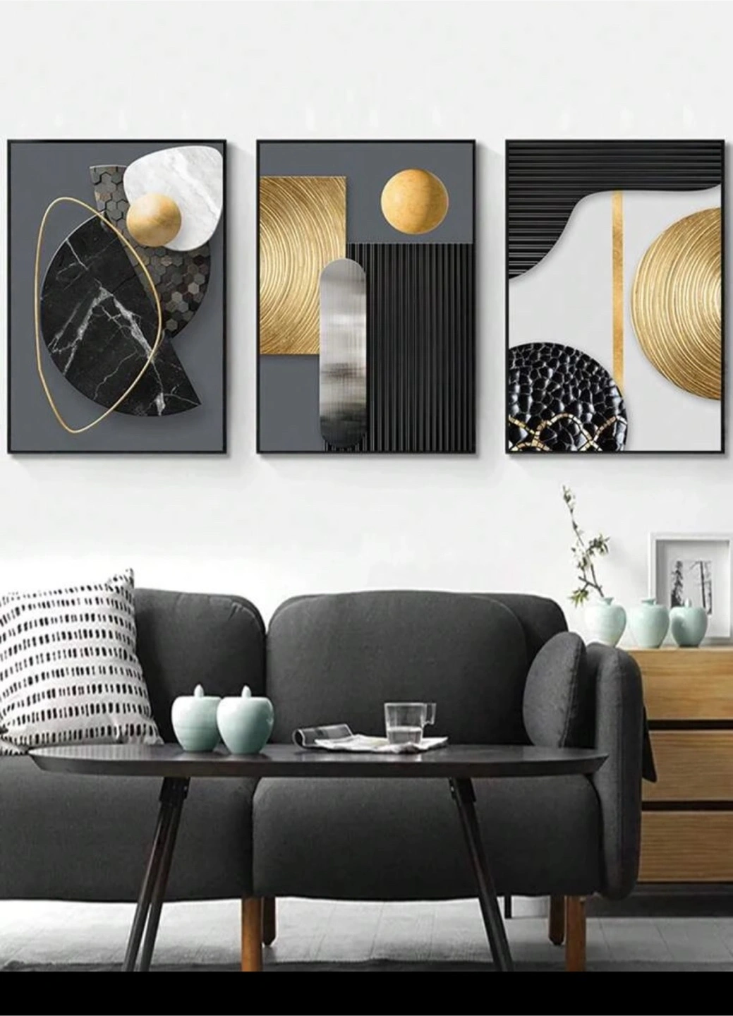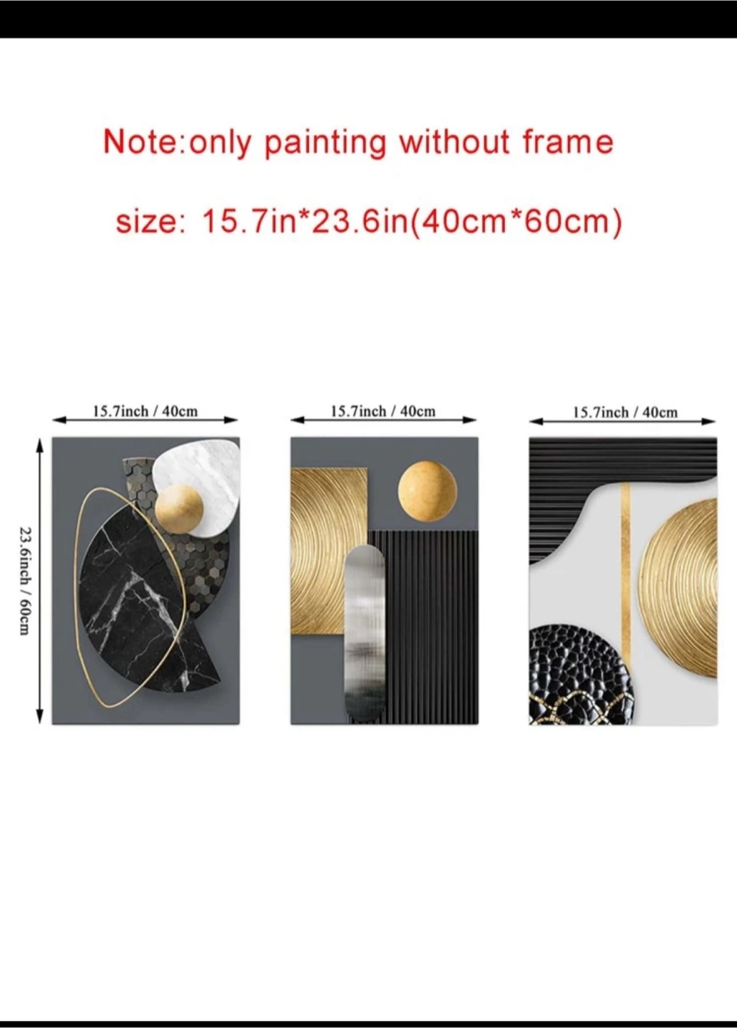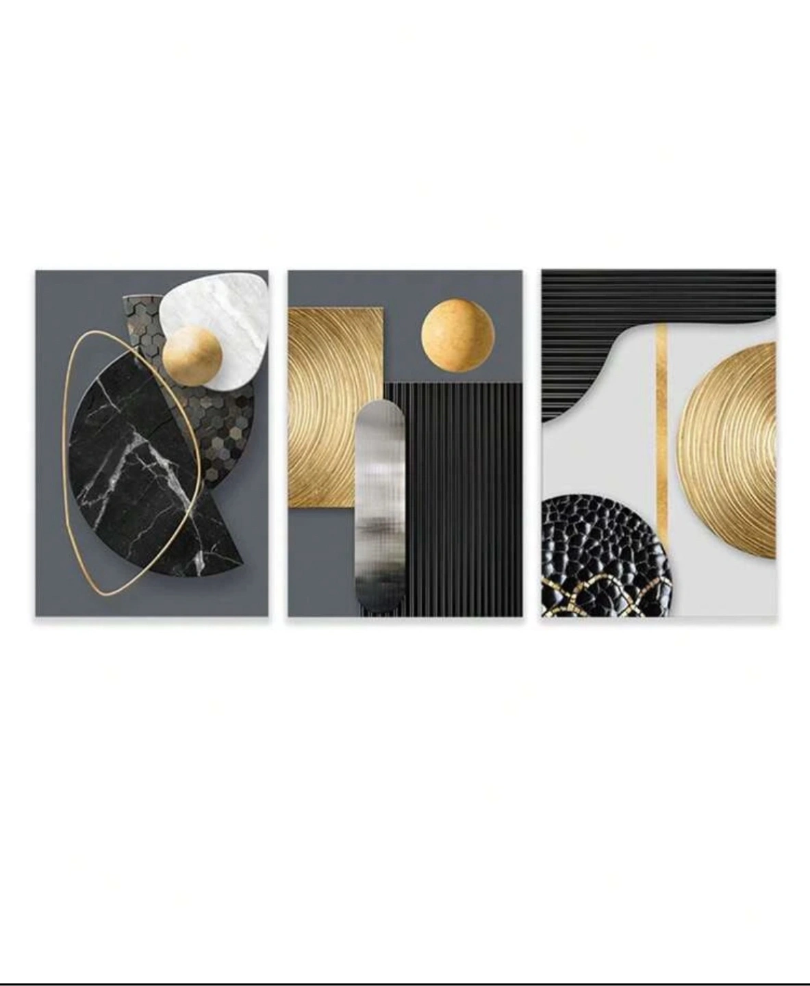 Three-piece abstract canvas print set. Modern geometric design. Gold and black colour scheme. No frame. Size: 15.7in*23.6in (40cm*60cm). Perfect for modern home decor.