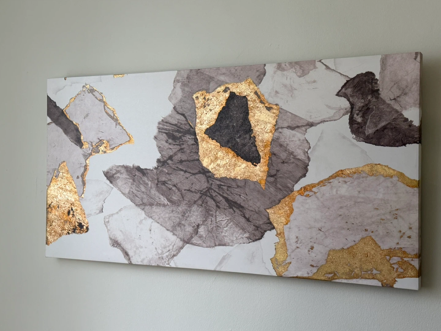 5Add a touch of modern elegance to your home with this abstract wall art! The gold accents really make it pop against the grey and white background. It's in great condition and ready to hang