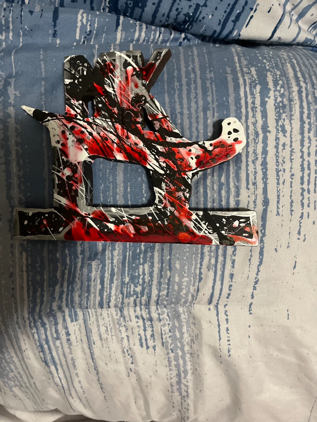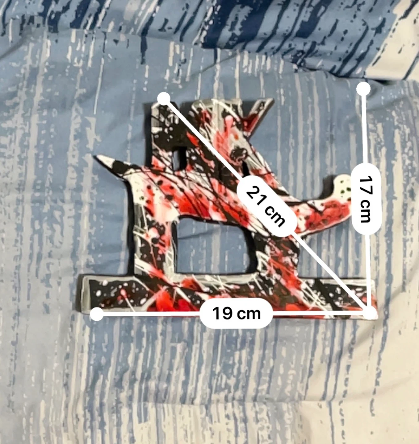 10Unique letter 'R' decor piece with a striking abstract design! It features a mix of black, white, and red paint splatters for a bold look. The dimensions are approximately 21 cm in height and 19 cm in width, making it a great size for a shelf or desk