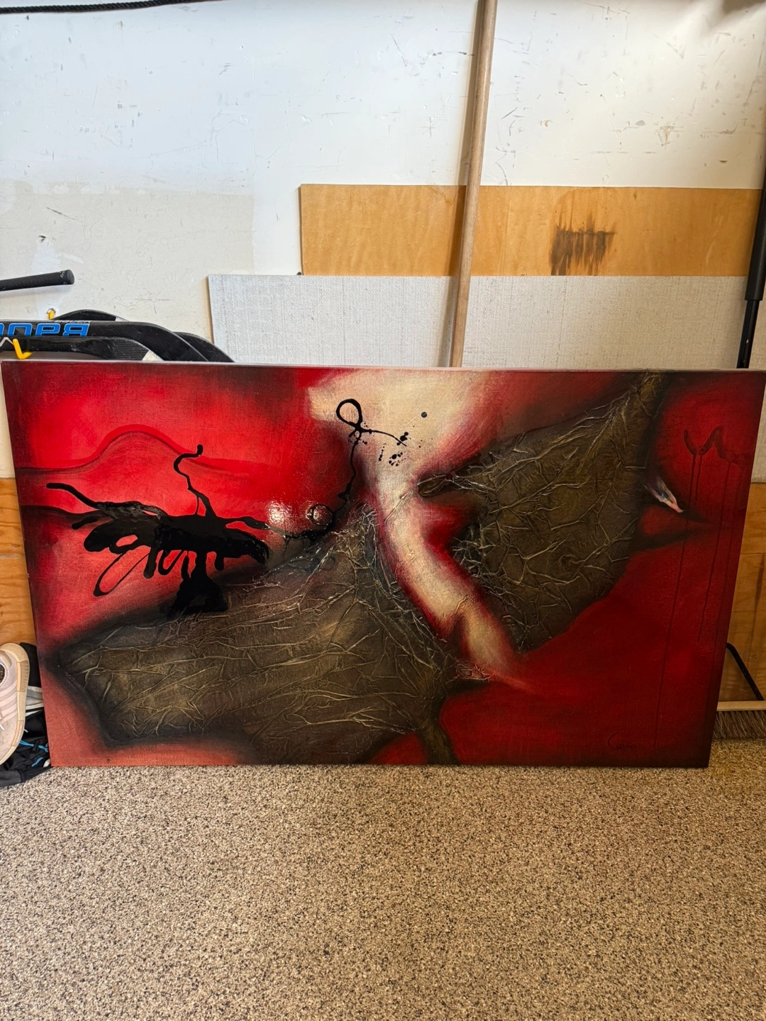 10This is a unique abstract painting featuring a striking combination of red and black. It would make a great addition to any home!