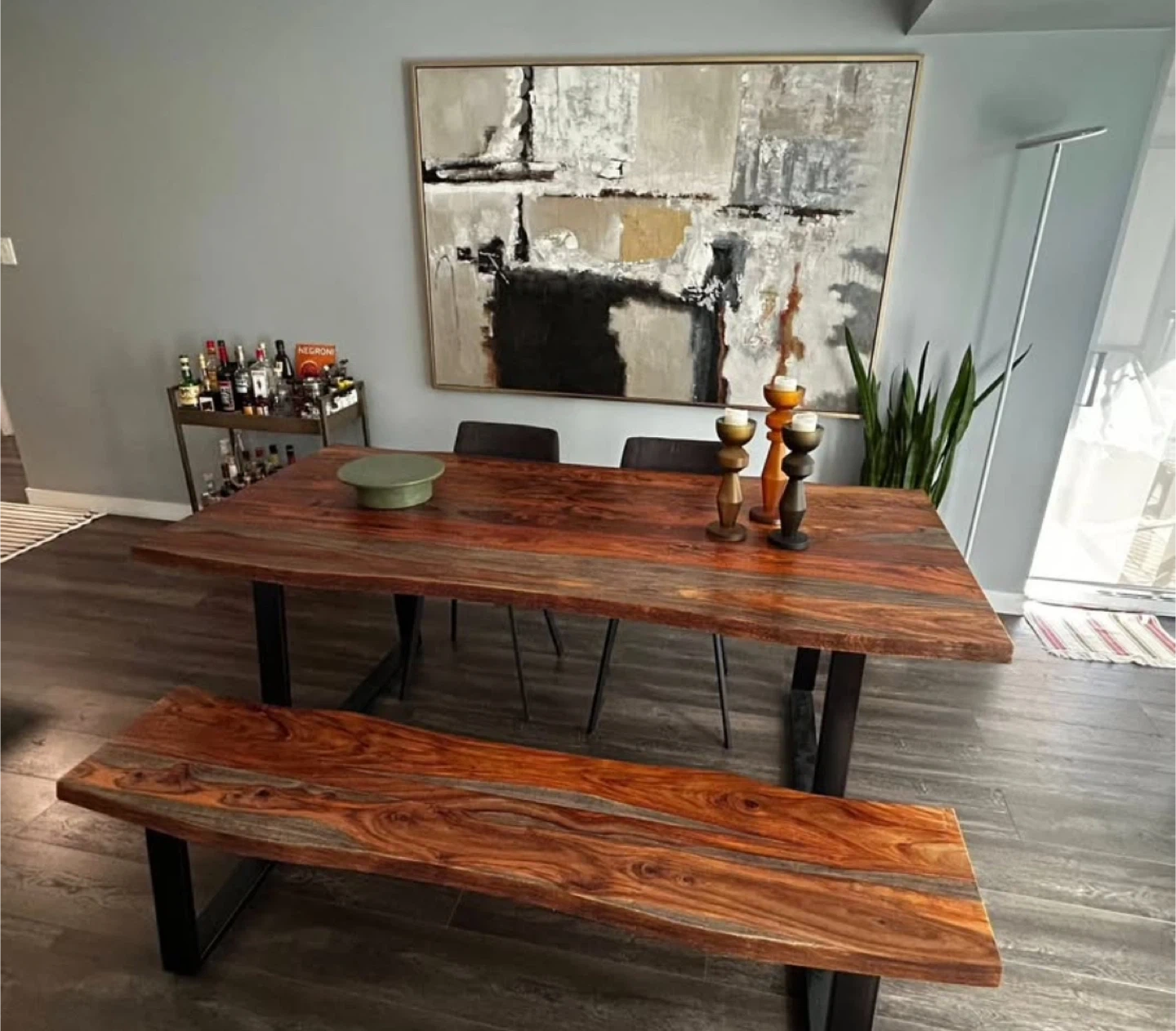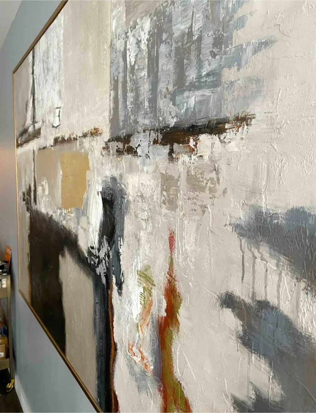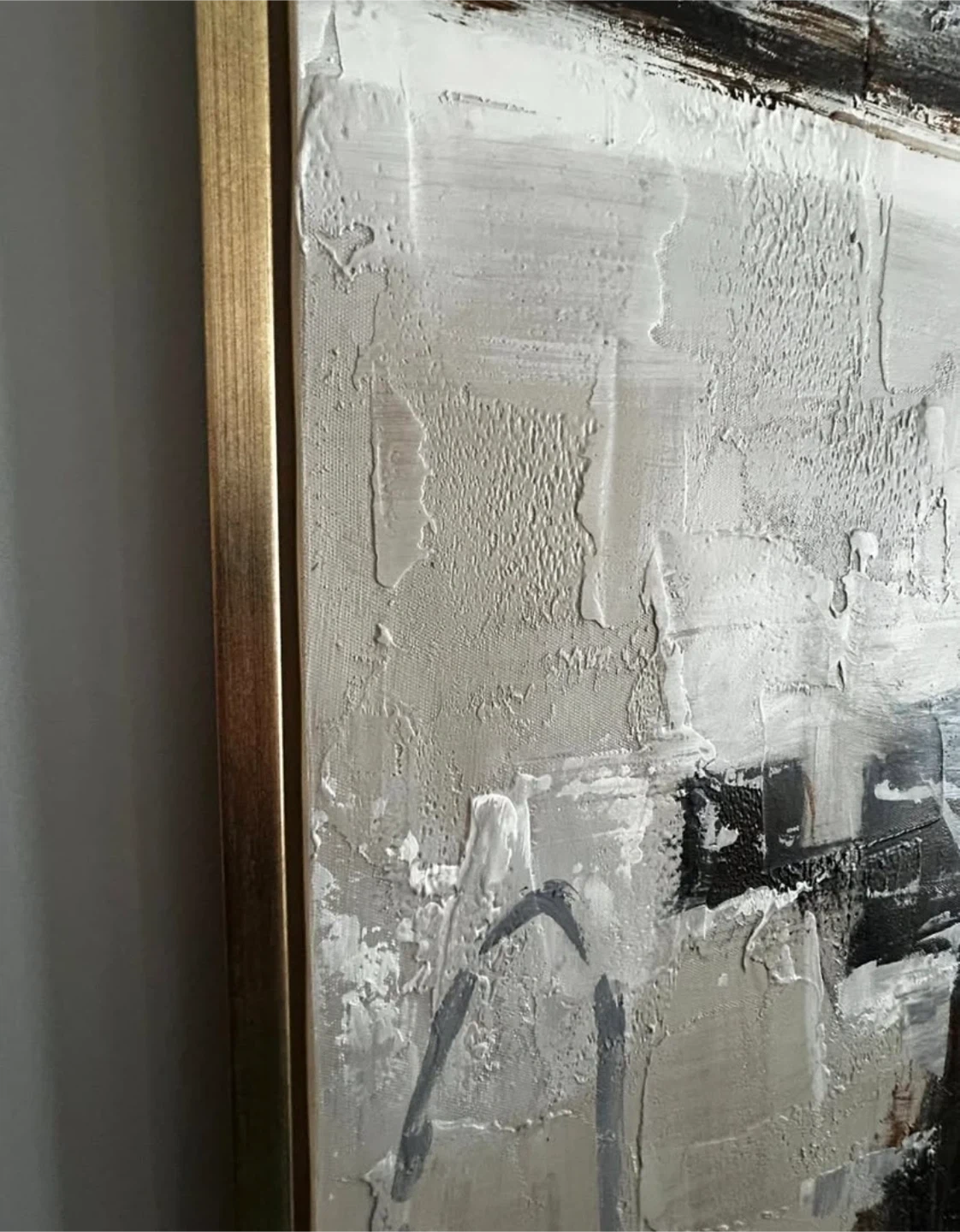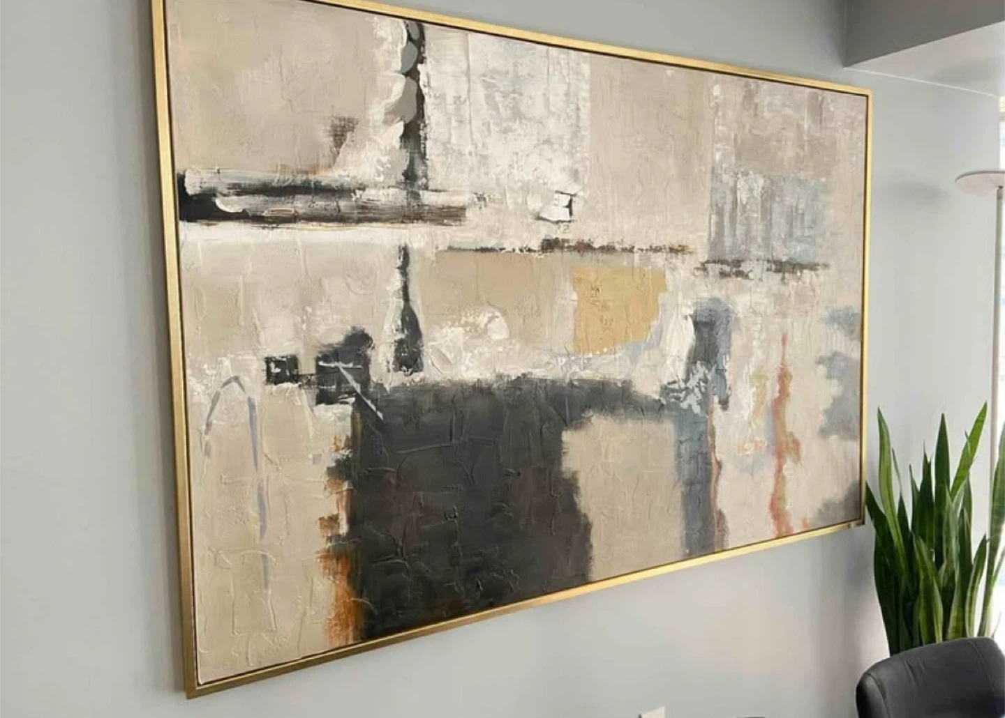 Selling a beautiful abstract painting that would look great in any room. The painting features a mix of neutral tones with black and gold accents, all framed in a stylish gold frame. It's in great condition and ready to hang! Dimensions: 74" x 49.5" x 1.5" Frame: Gold/Brass Great condition. Available for pick-up in Distillery District.